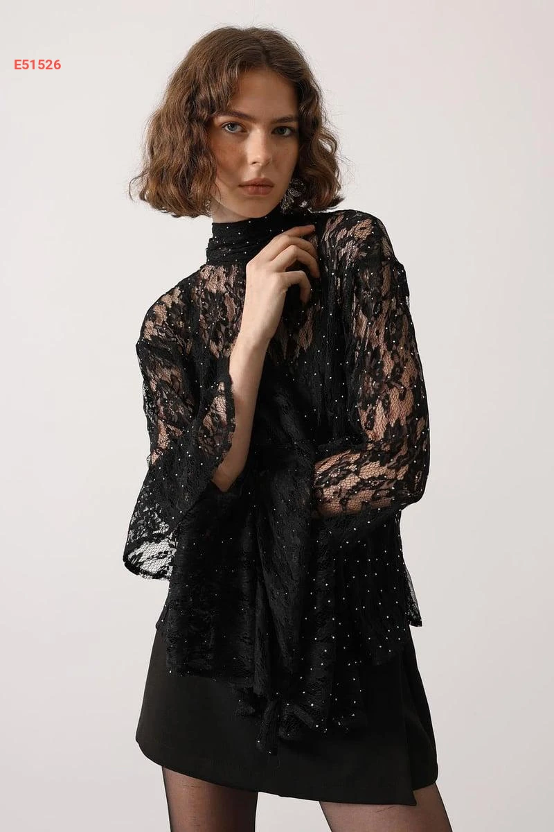 بلوزة دانتيل حجرية مرصعة بأكمام كلوش