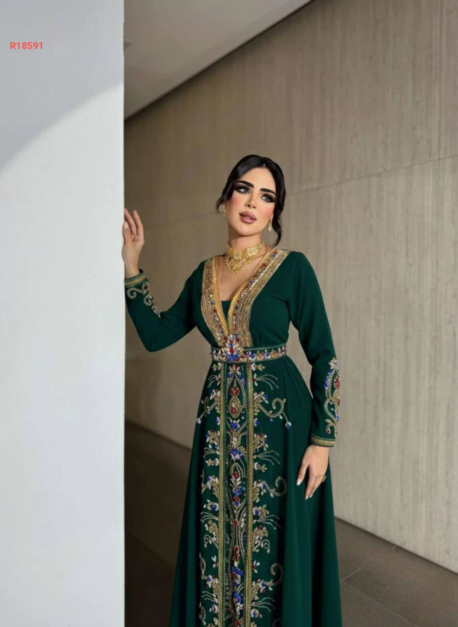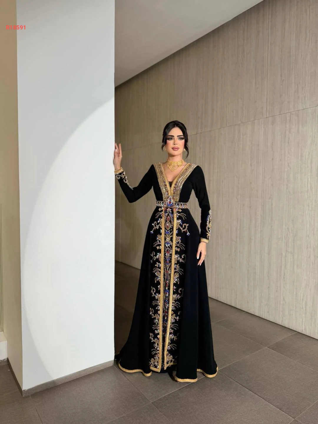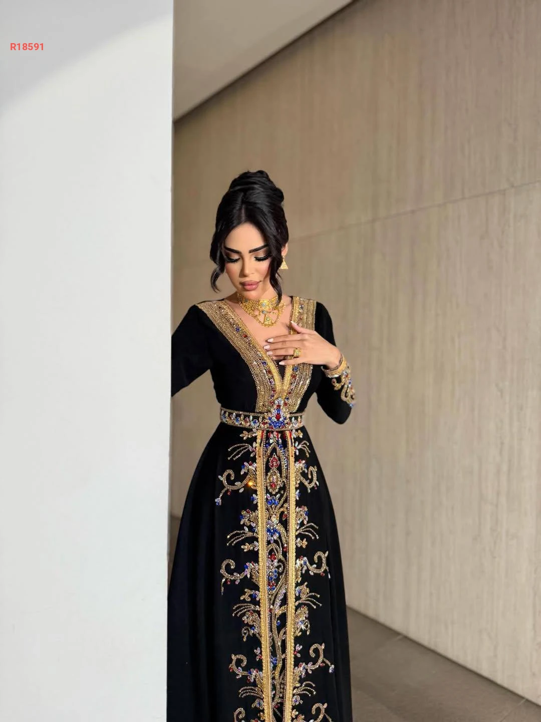 قفطان قطعتين بتطريز ذهبي مرصع بالشك مع حزام