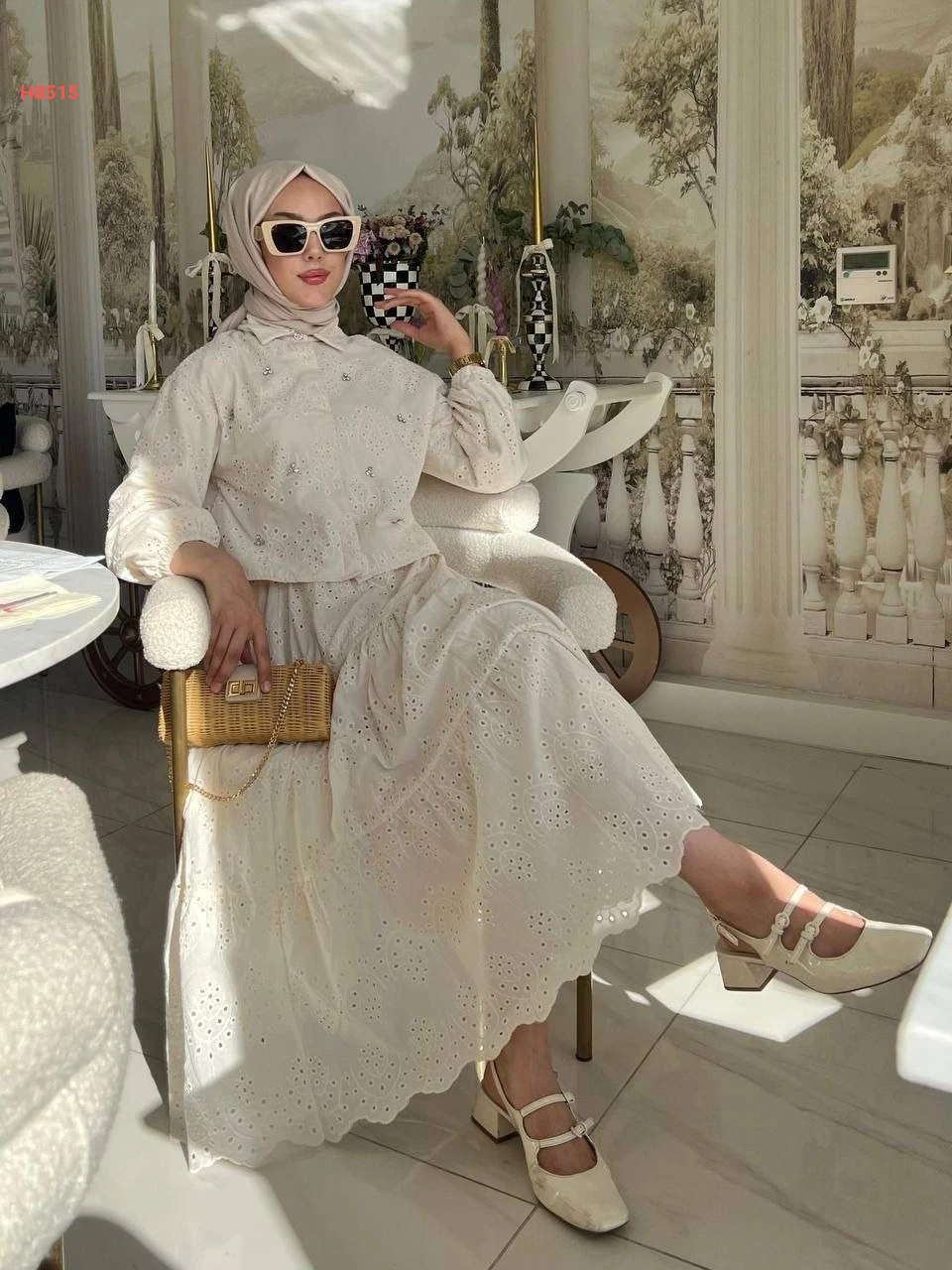 طقم قطعتين، قميص مُطرز بالفصوص وتنورة "كلوش" واسعة من قماش الدانتيل المُفرغ،