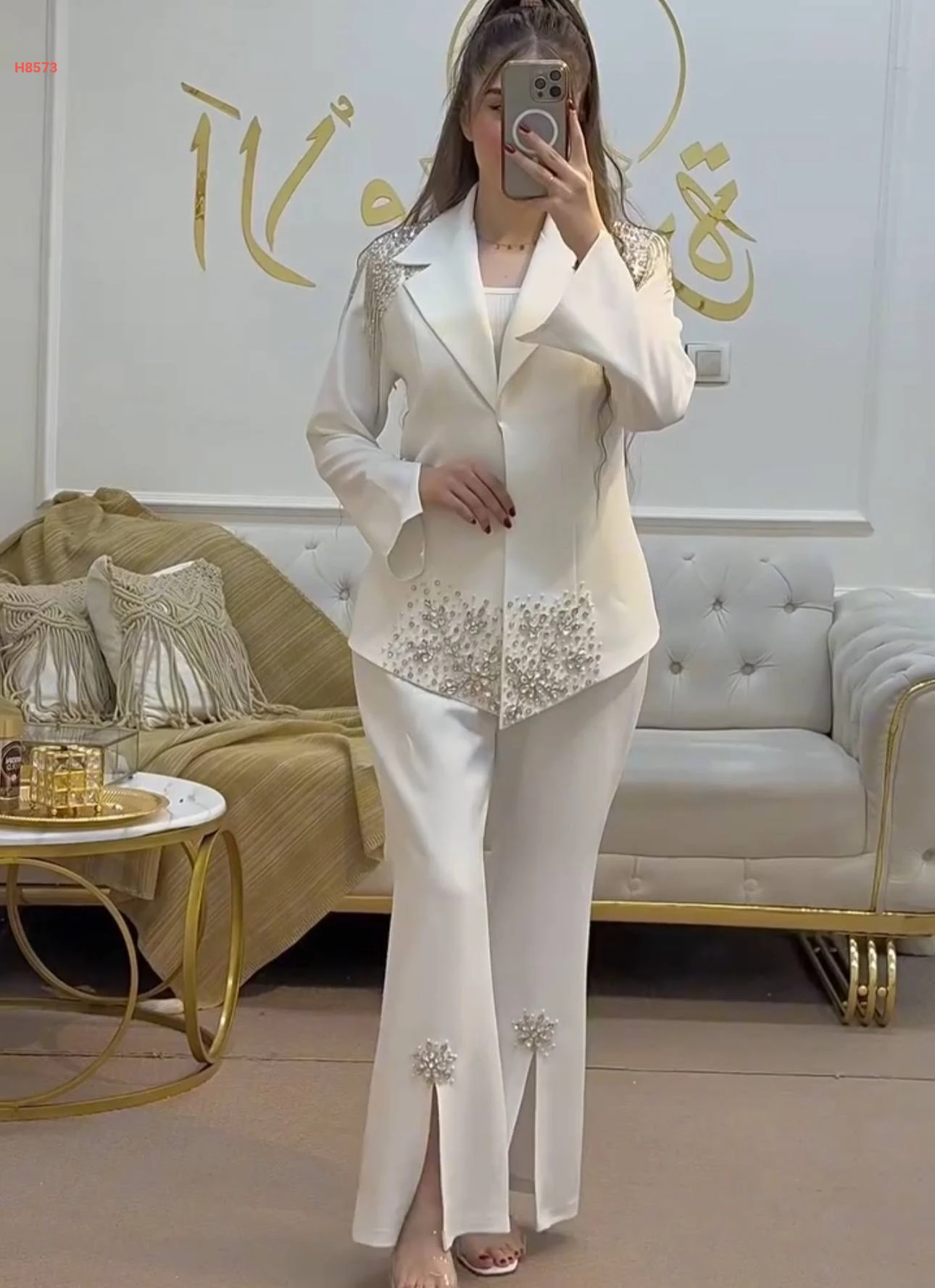 طقم للمناسبات قطعتين بأزرار ، مزين بالكريستال مع سلاسل عند الكتف