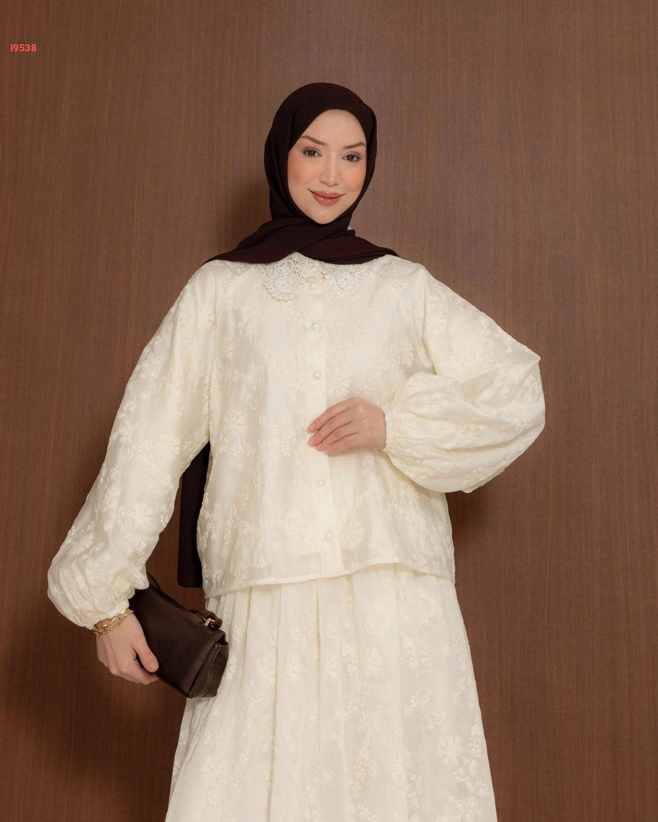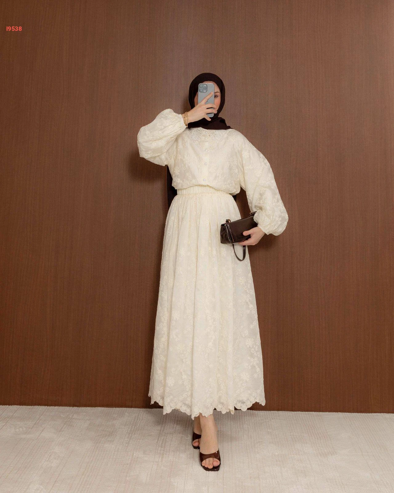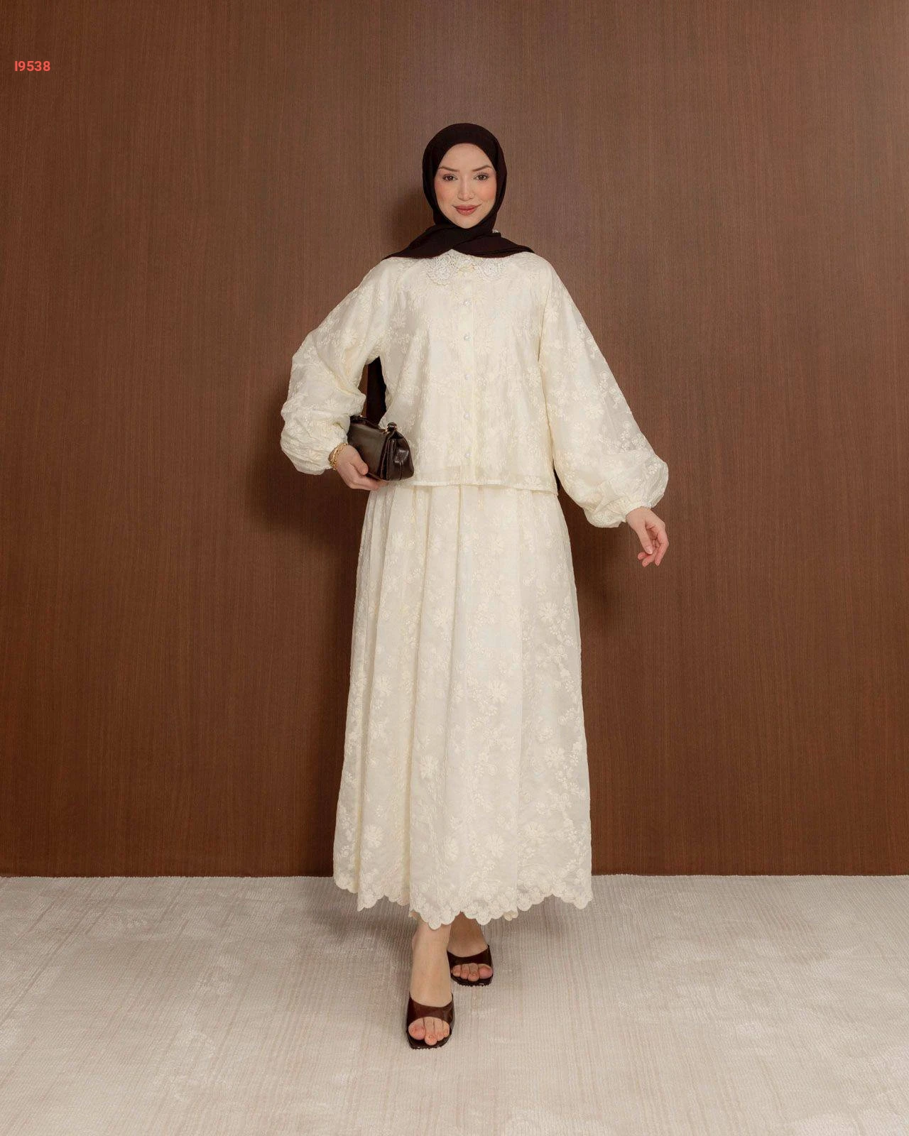 طقم قطعتين باللون السكري، يتميز بتطريزات ورد بارزة مع أكمام منفوخة وياقة دانتيل كلاسيكية
