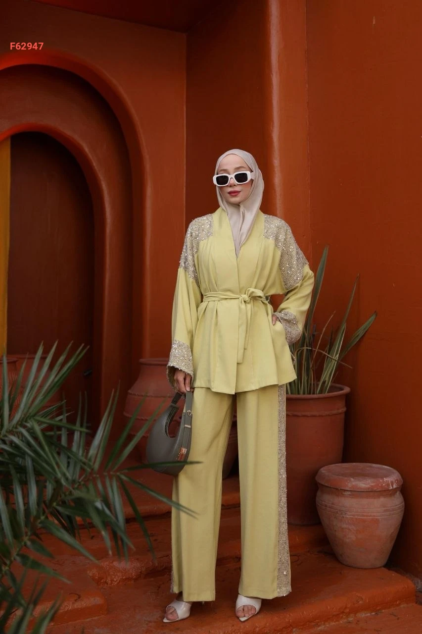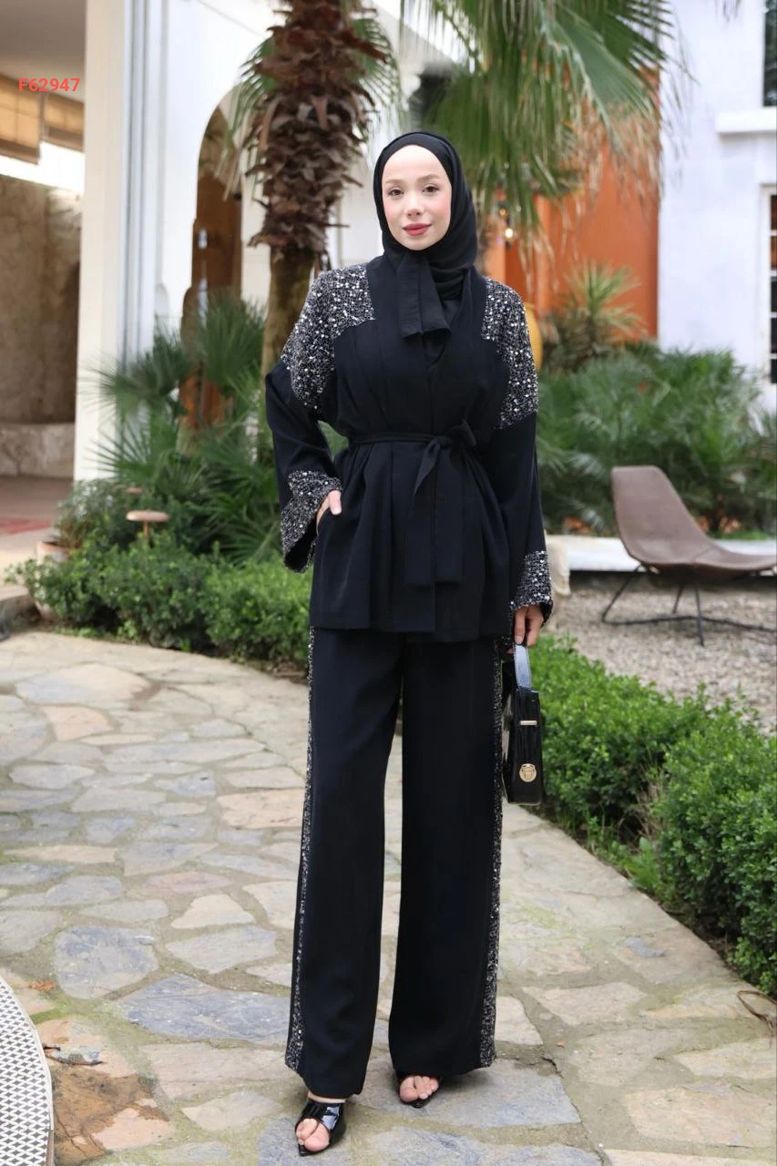 طقم قطعتين بتصميم "كيمونو" عصري مزين بتفاصيل الترتر اللامع على الأكتاف والأكمام،