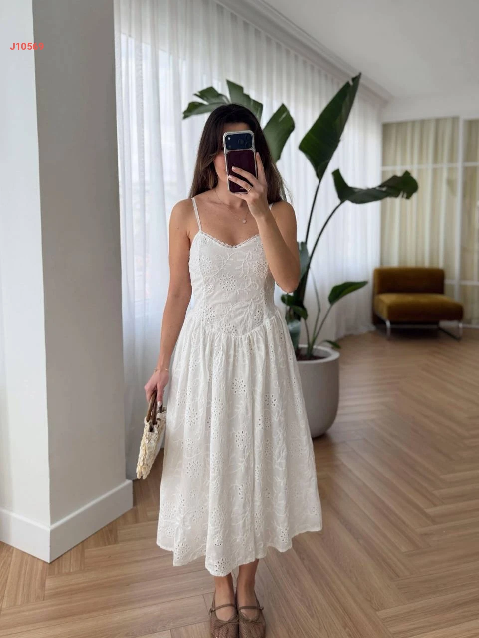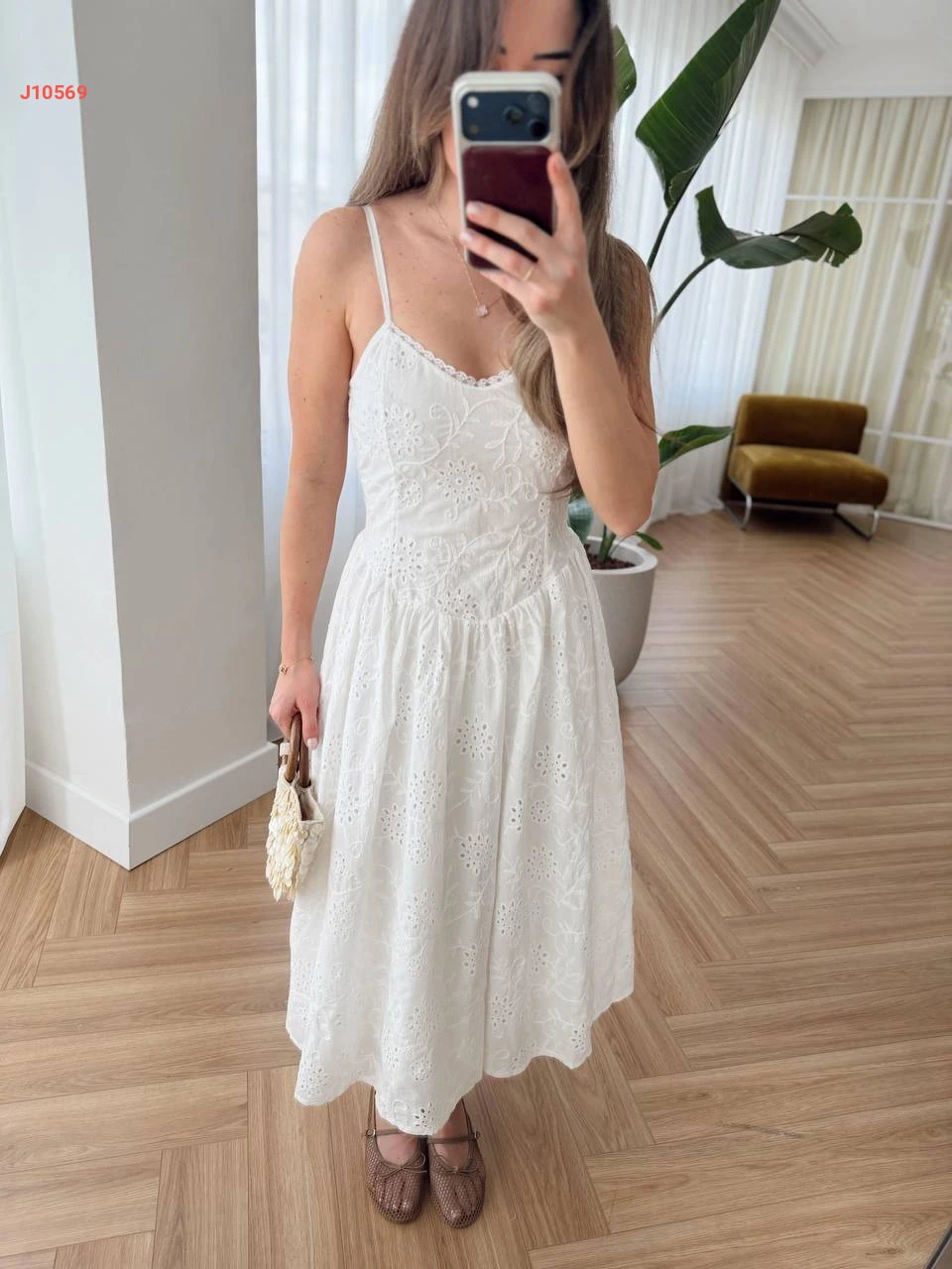 فستان أبيض مطرز بحمالات رفيعة