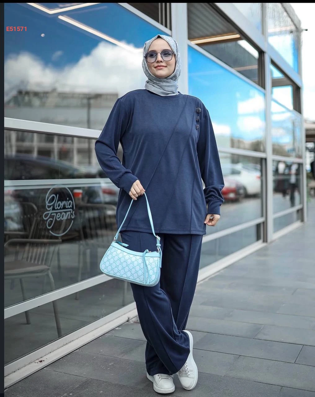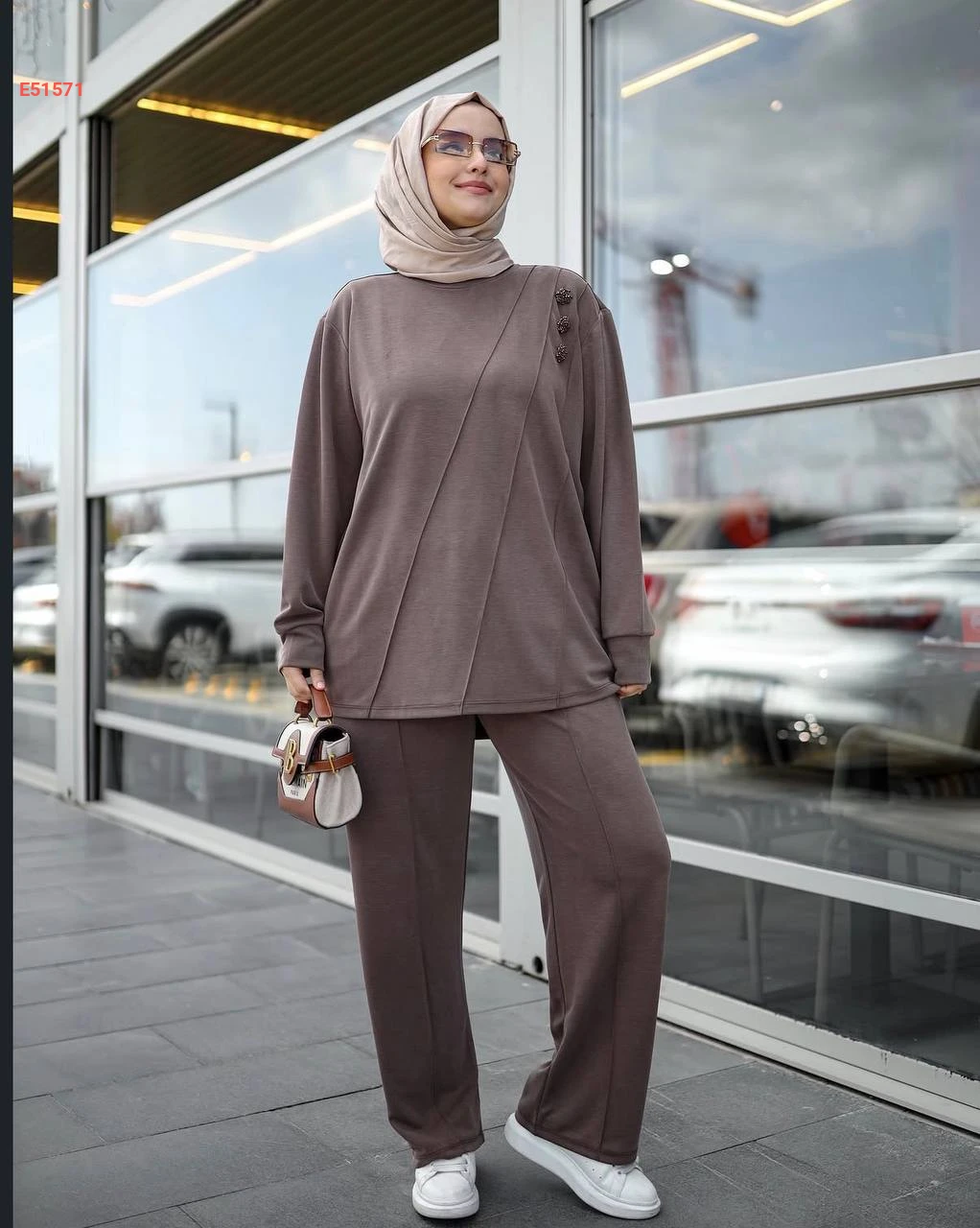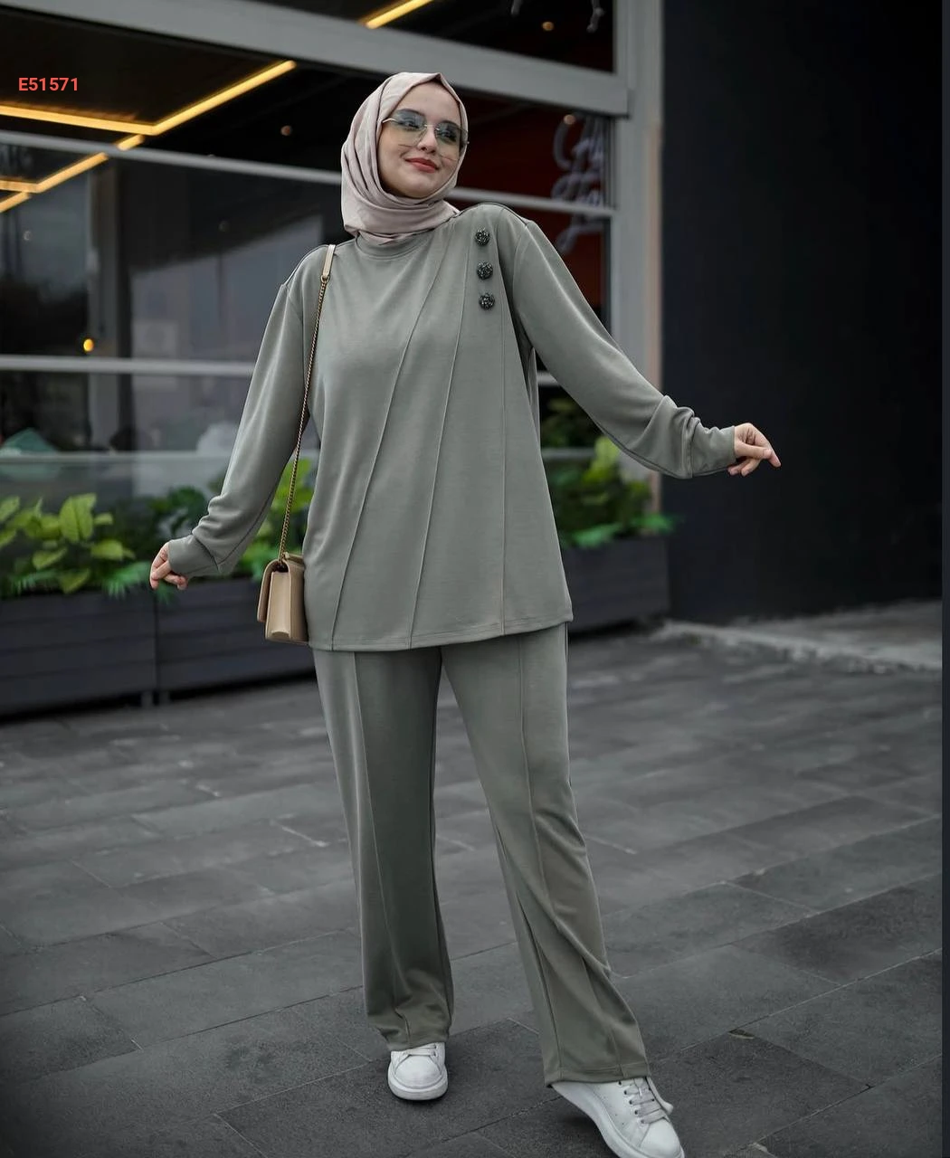 طقم نسائي قطعتين بتصميم عصري وأنيق، يتميز ببلوزة ذات تفاصيل أزرار جانبية وبنطال واسع مريح،