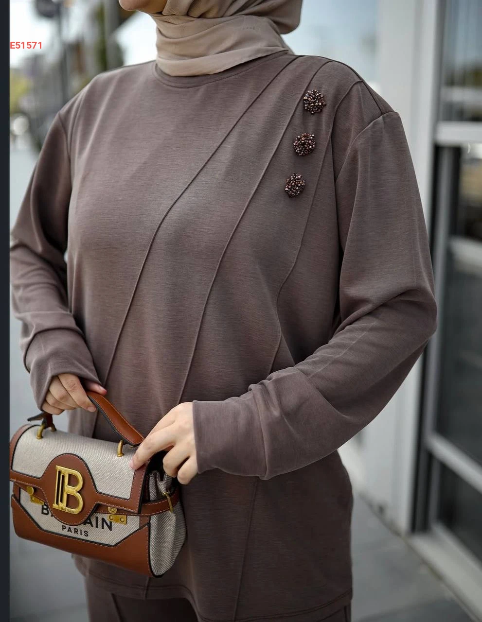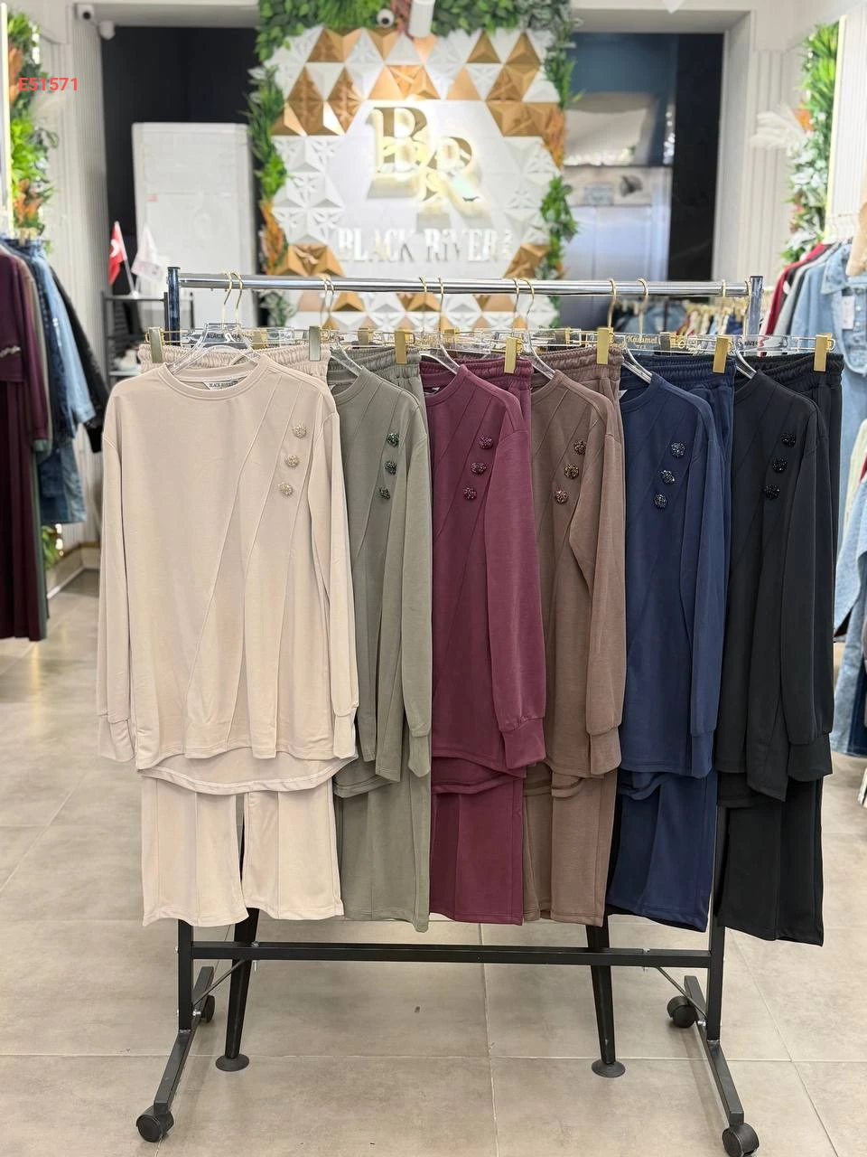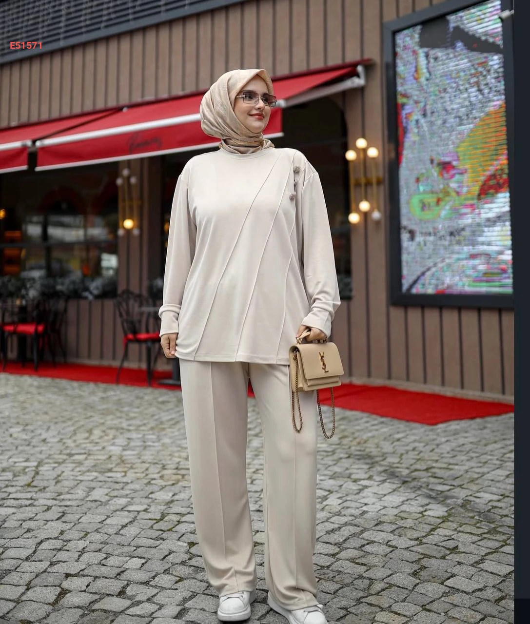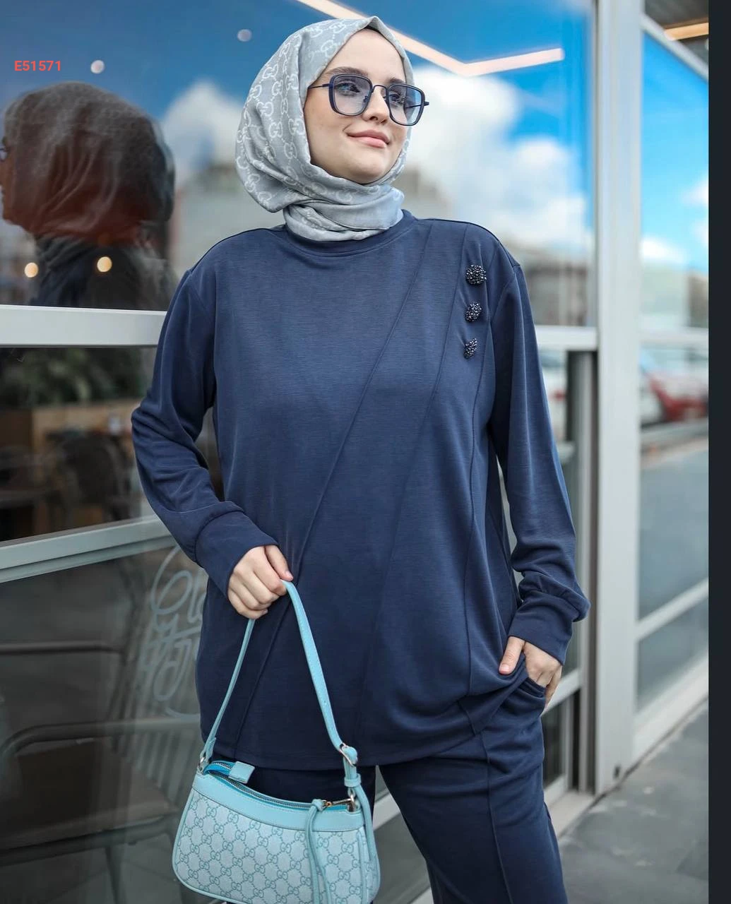 طقم نسائي قطعتين بتصميم عصري وأنيق، يتميز ببلوزة ذات تفاصيل أزرار جانبية وبنطال واسع مريح،