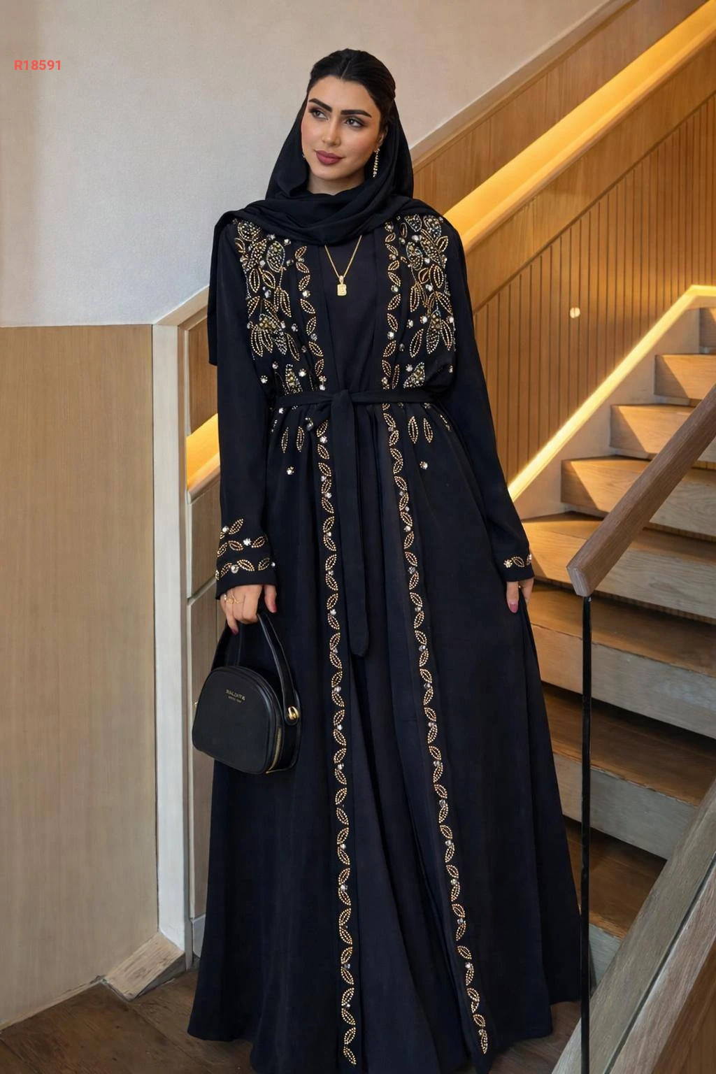 طقم عباية مع فستان مرصعة بالستراس والألماس مع حزام