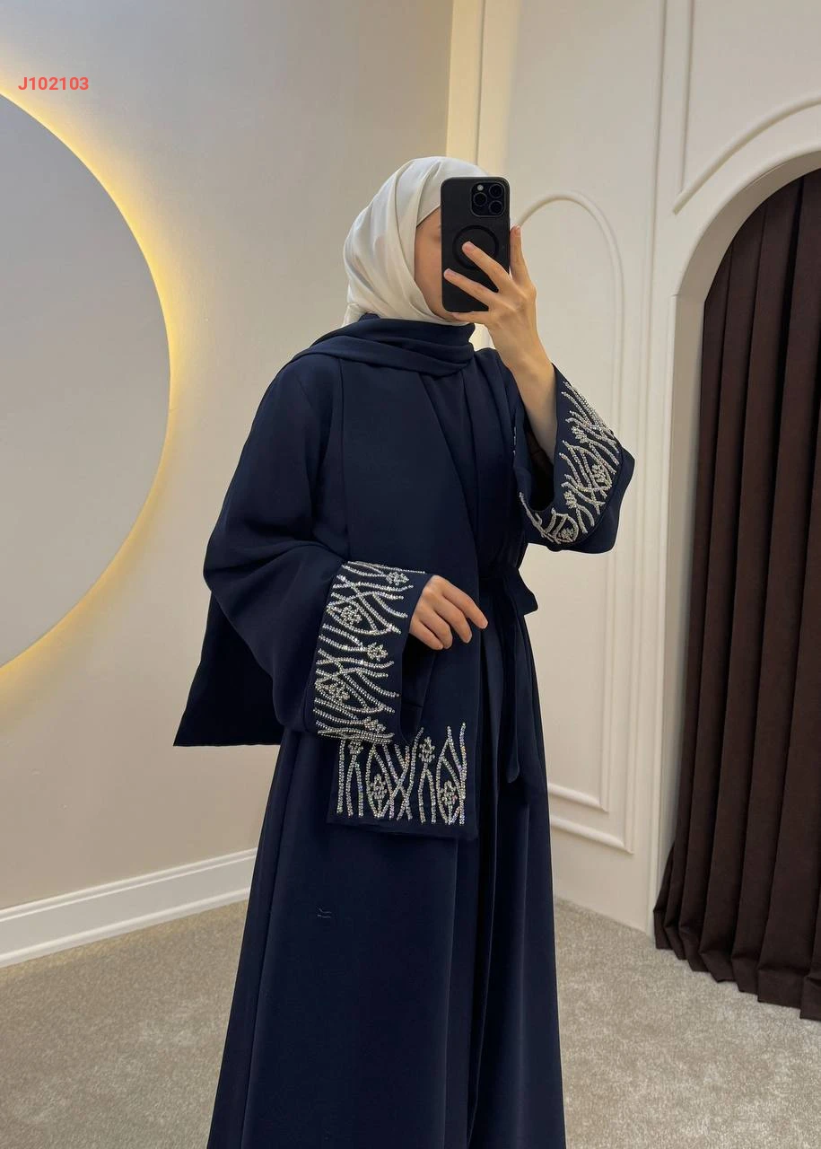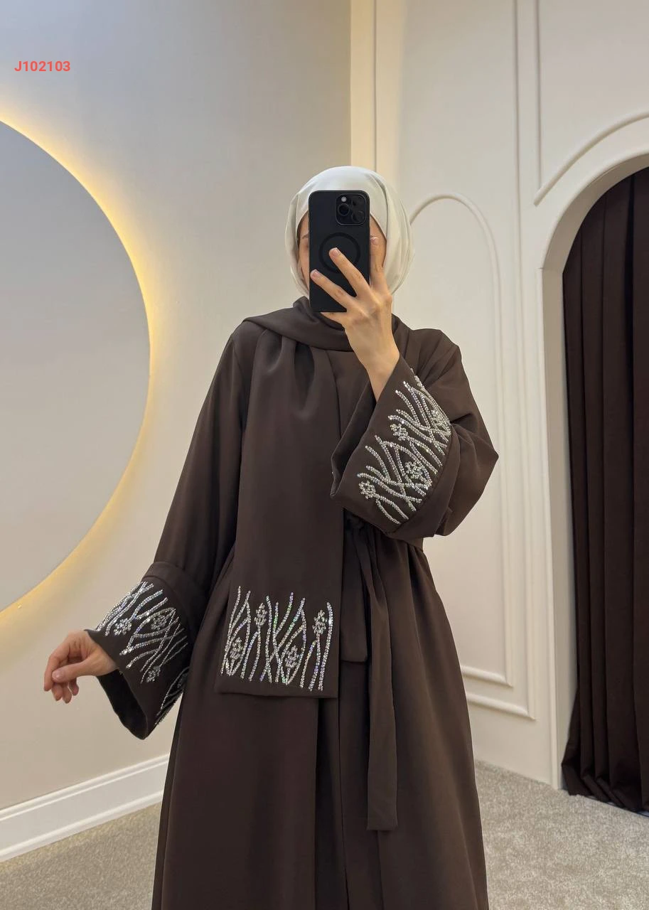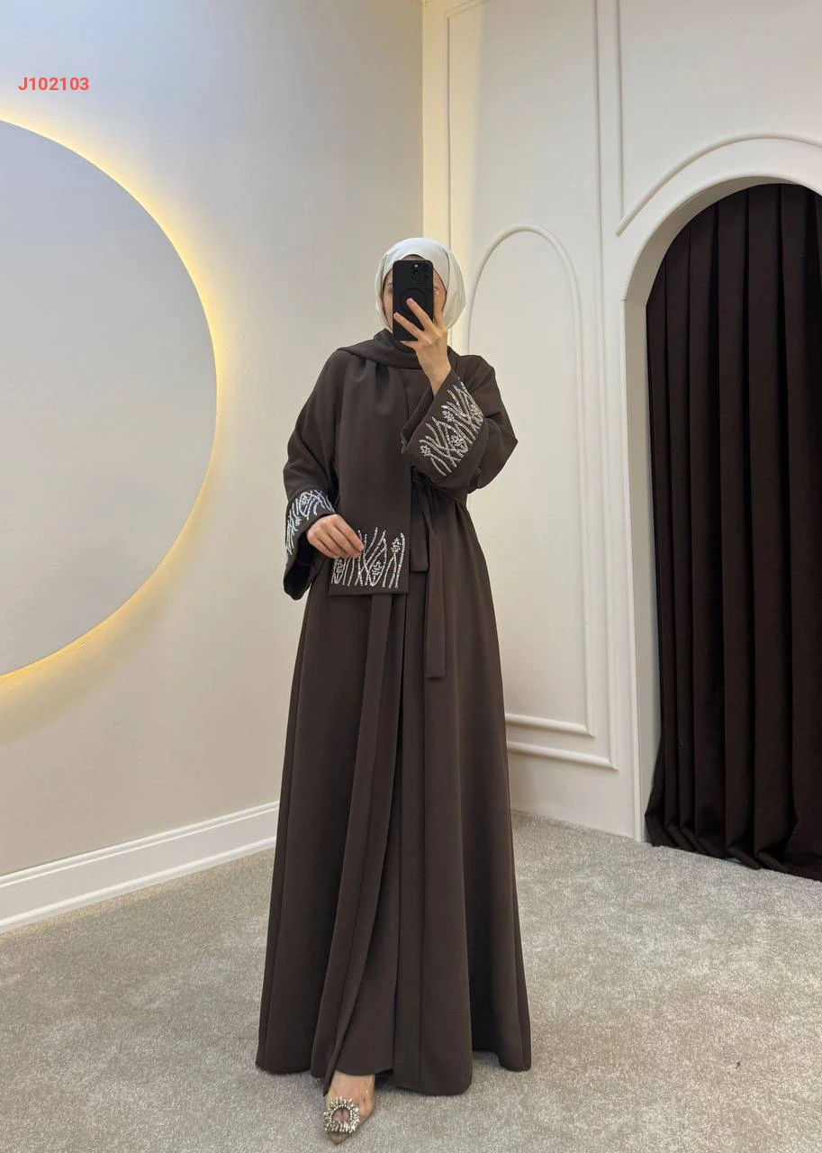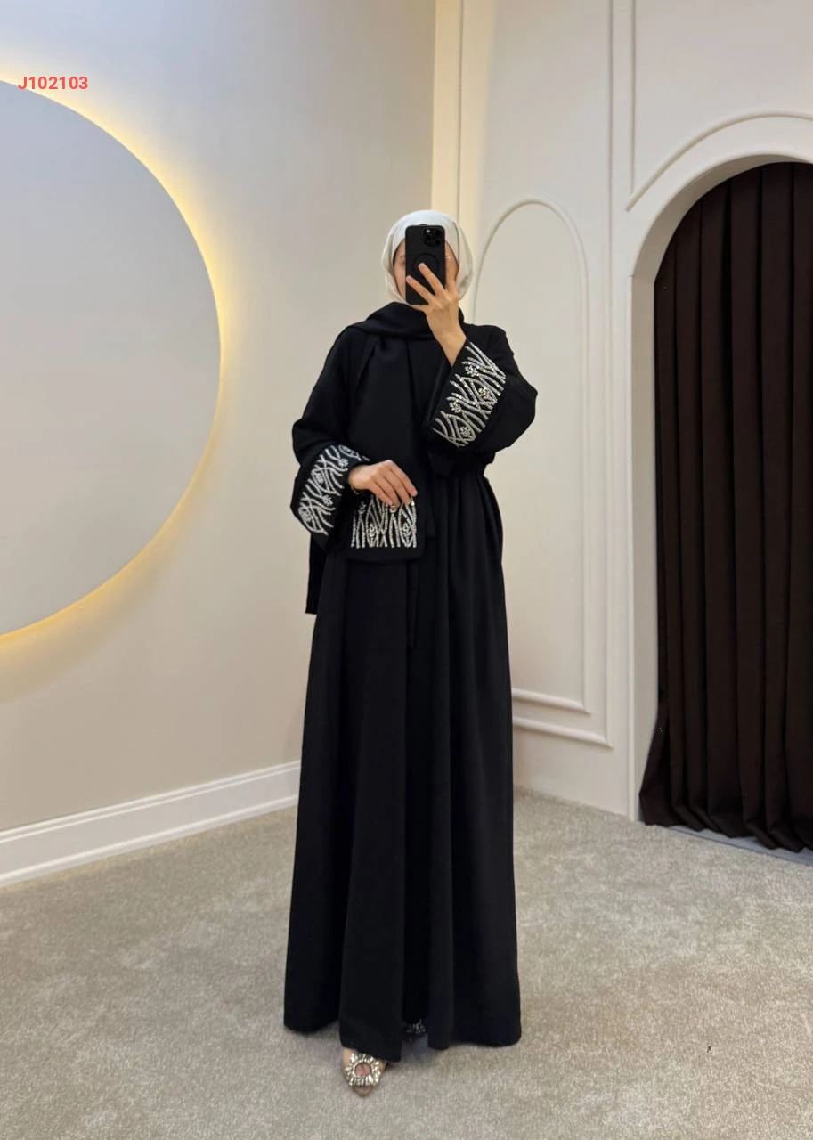 طقم عباية مع فستان سادة بأكمام وشال مزين بالستراس