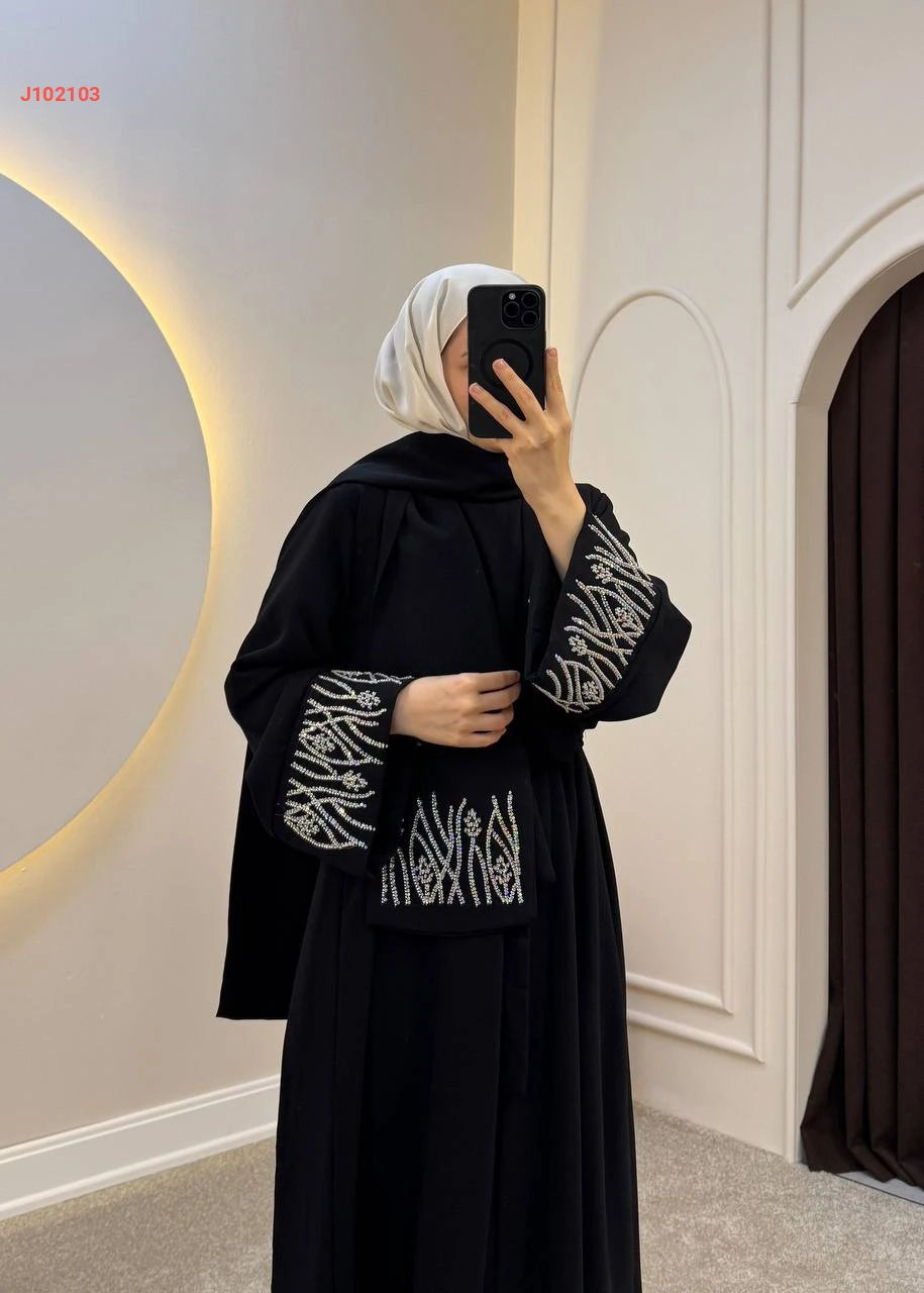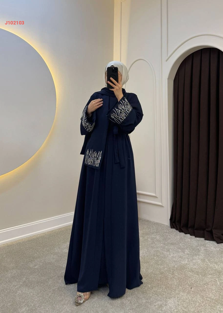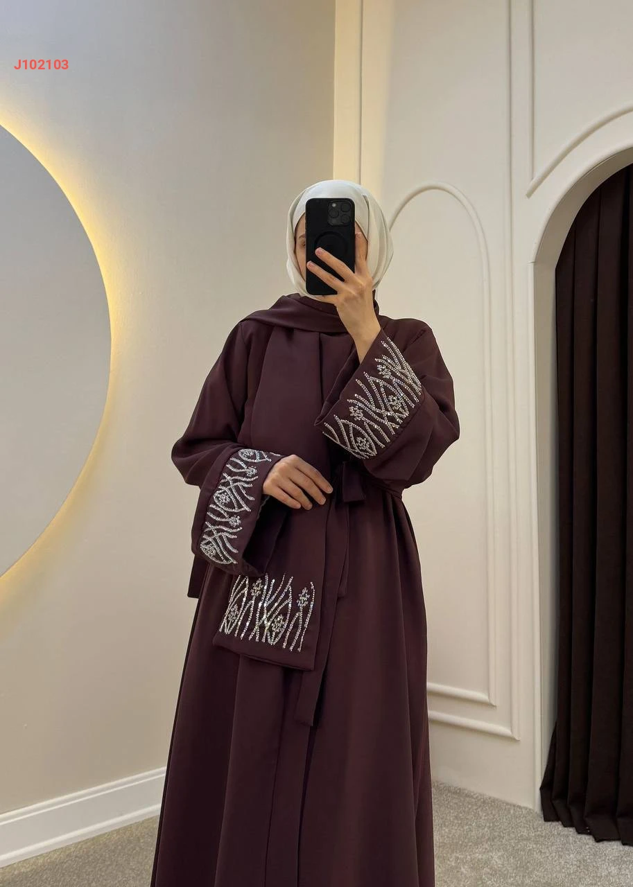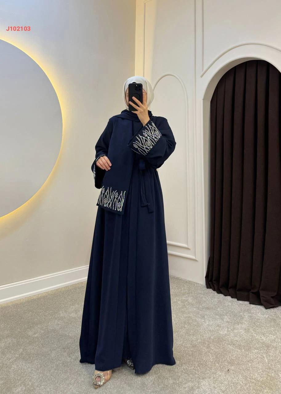 طقم عباية مع فستان سادة بأكمام وشال مزين بالستراس
