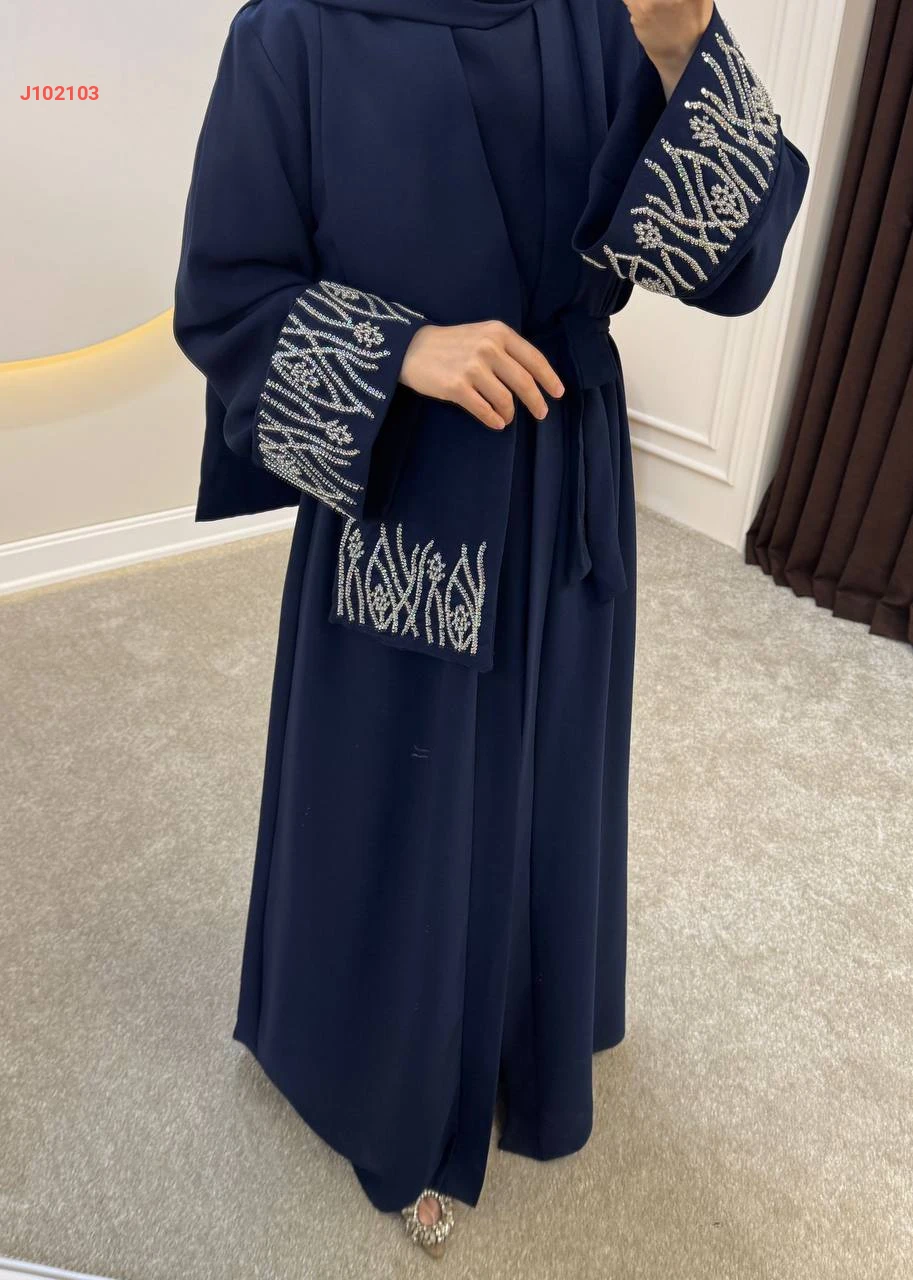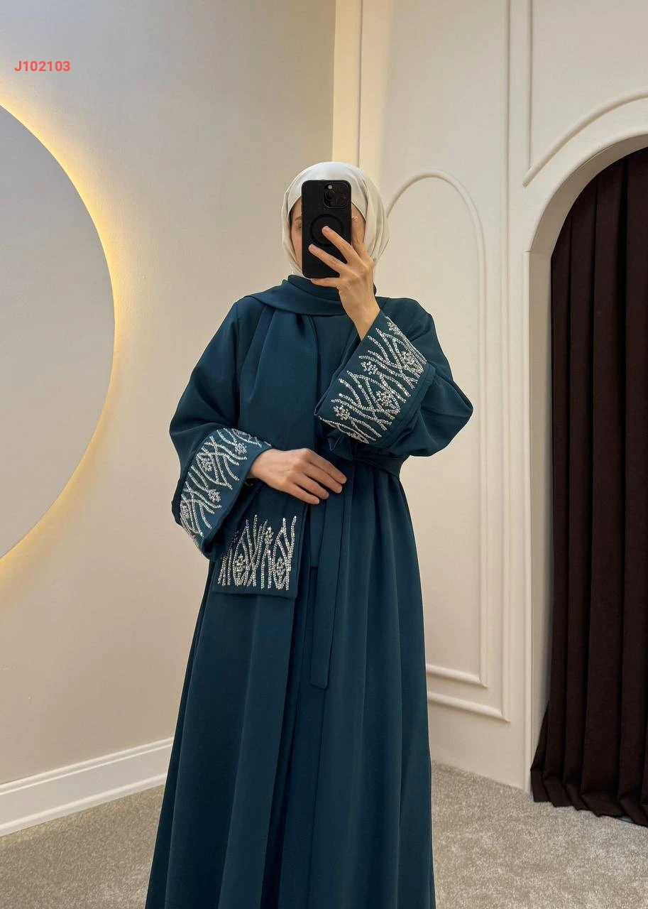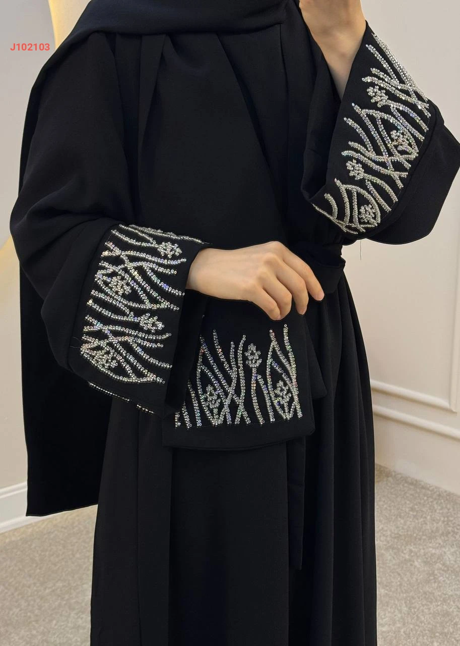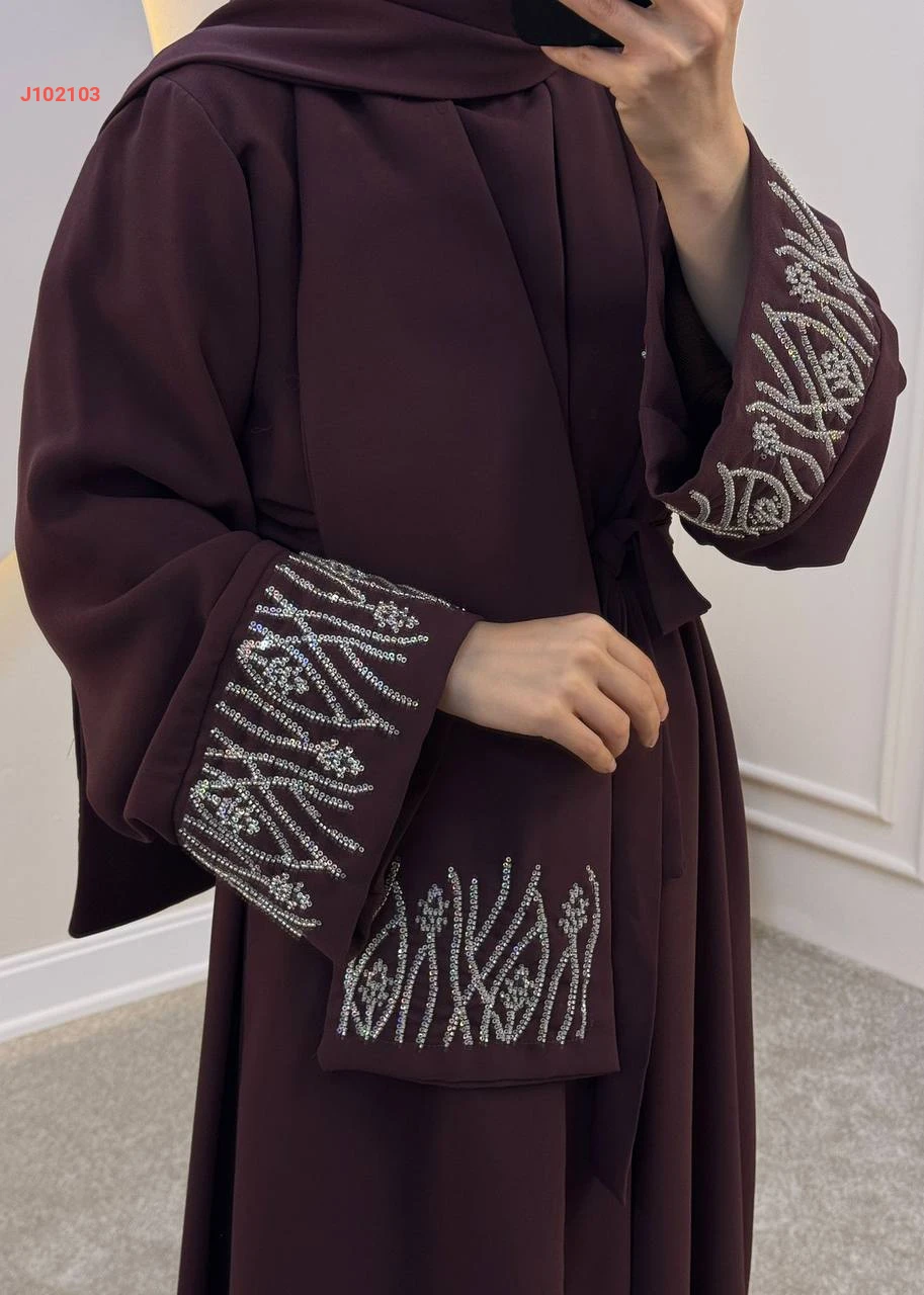 طقم عباية مع فستان سادة بأكمام وشال مزين بالستراس