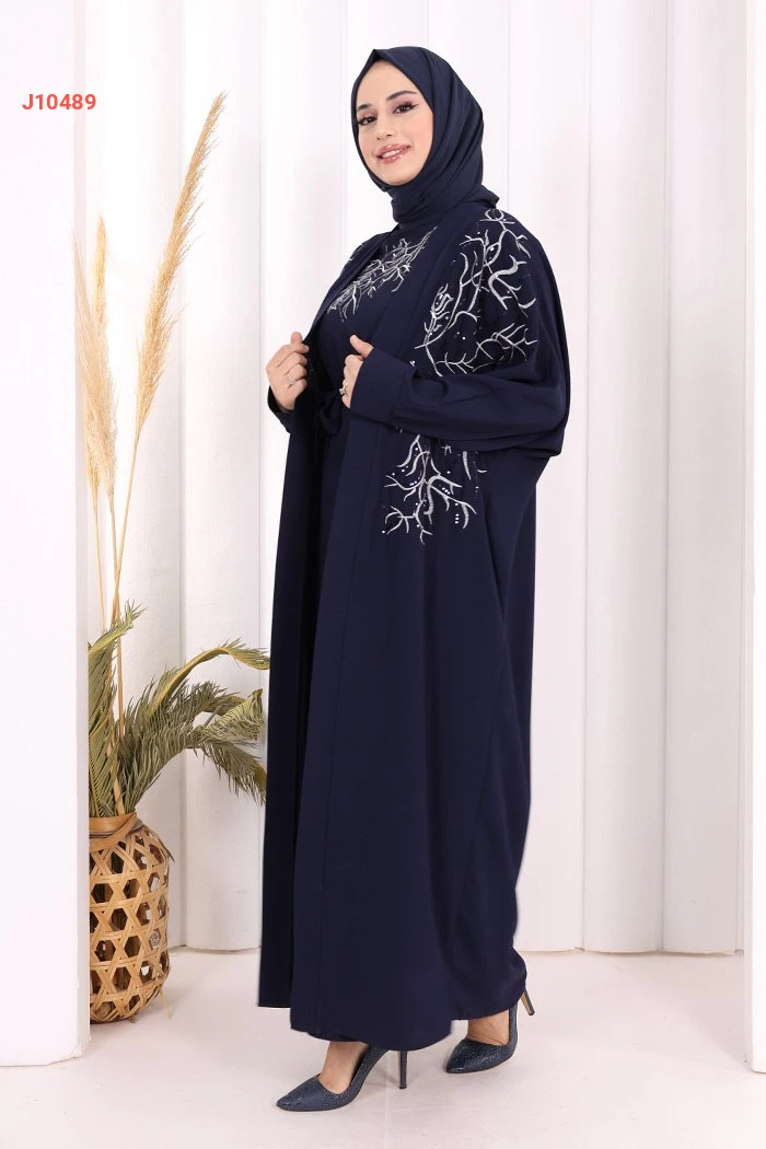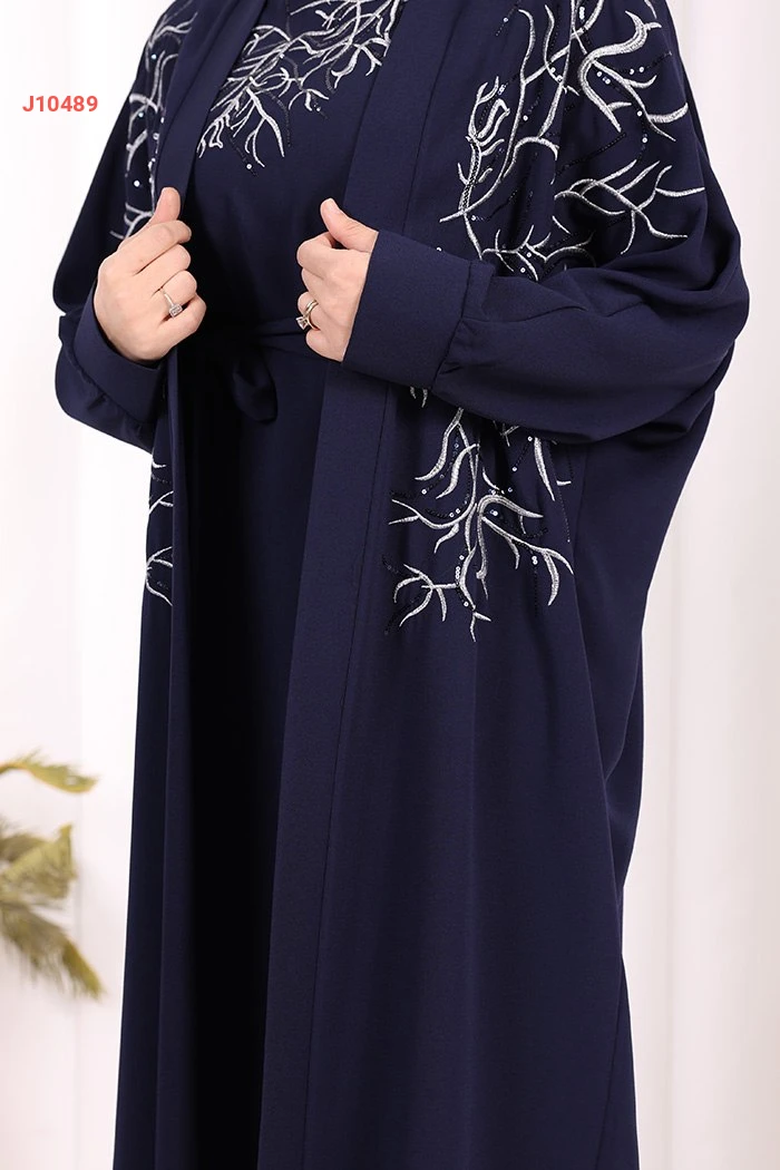 طقم عباية مع فستان تطريز فضي مع حزام