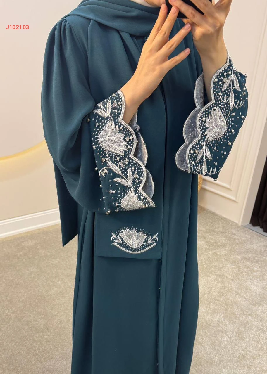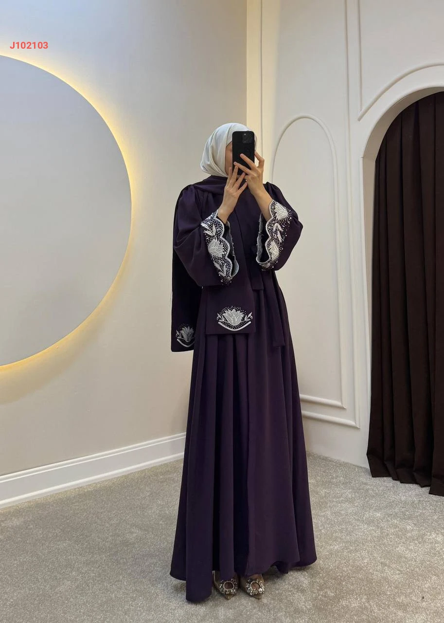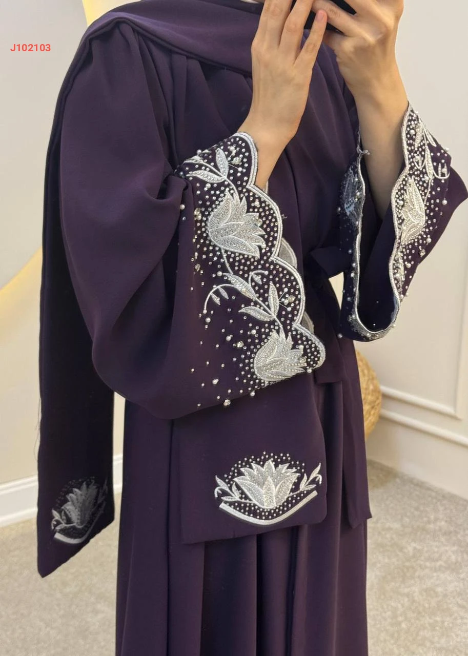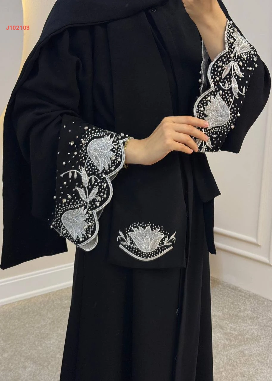 عباية بأزرار مع شال وأكمام تطريز شك فضي مع حزام
