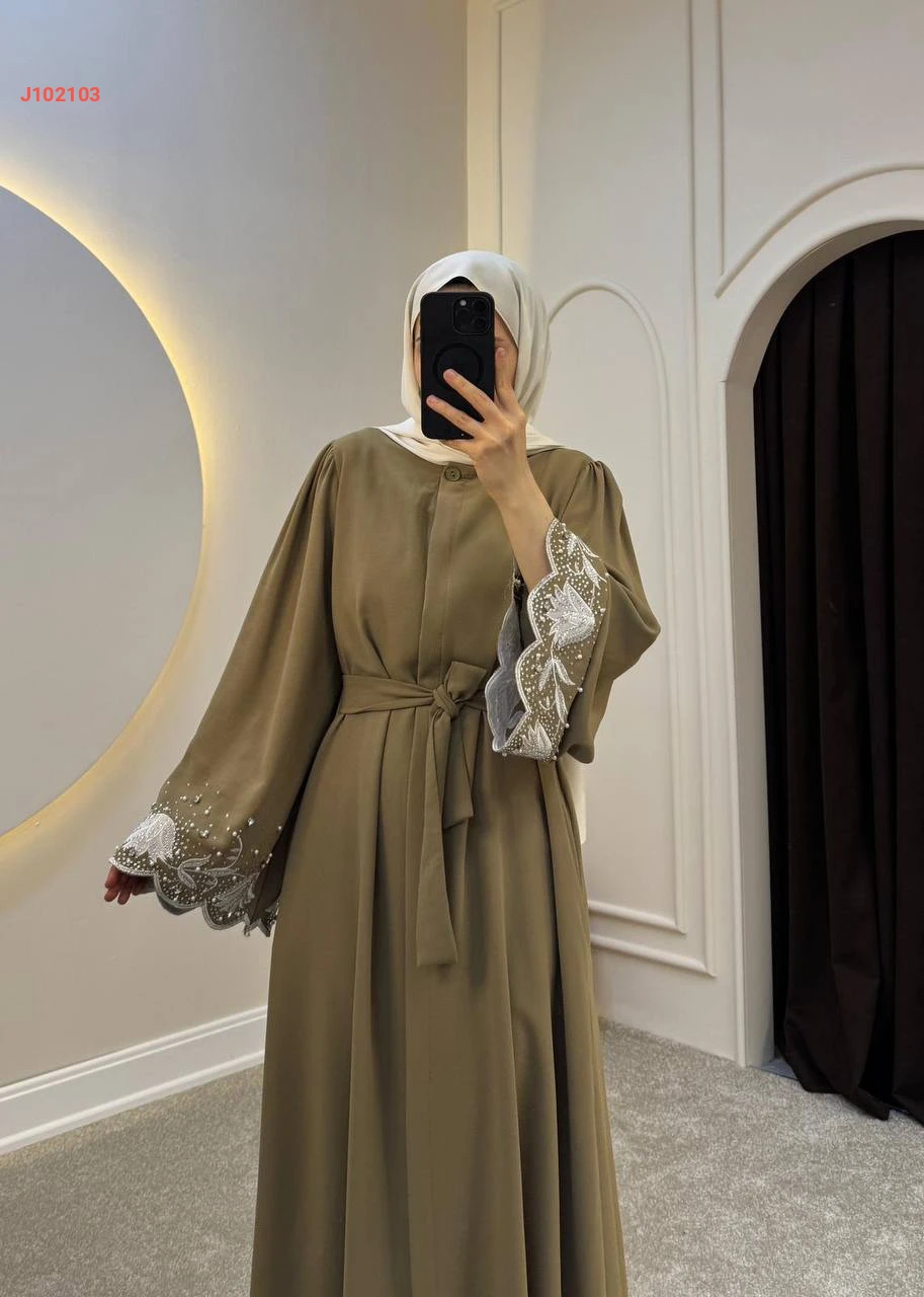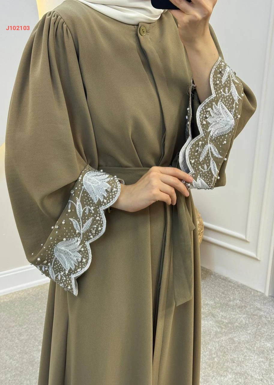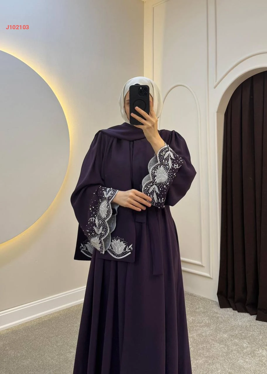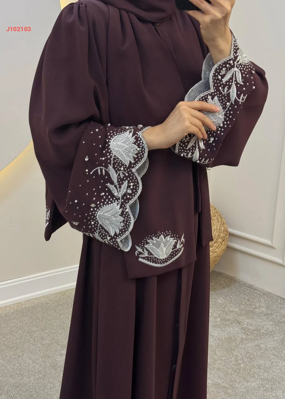 عباية بأزرار مع شال وأكمام تطريز شك فضي مع حزام