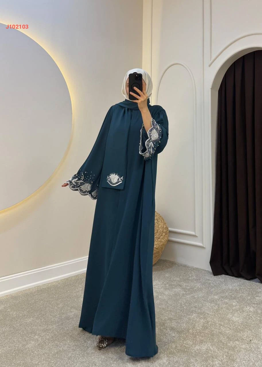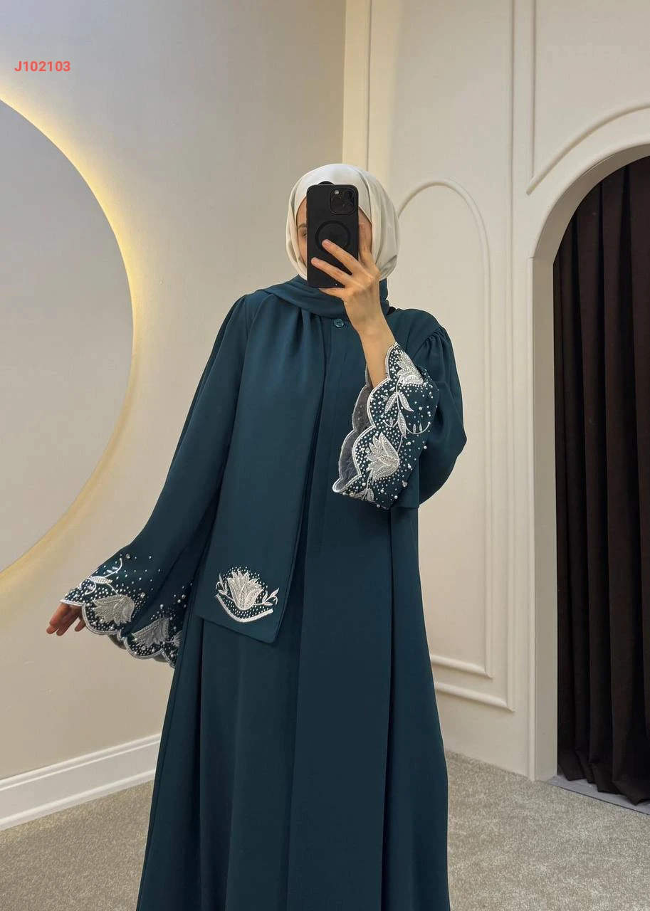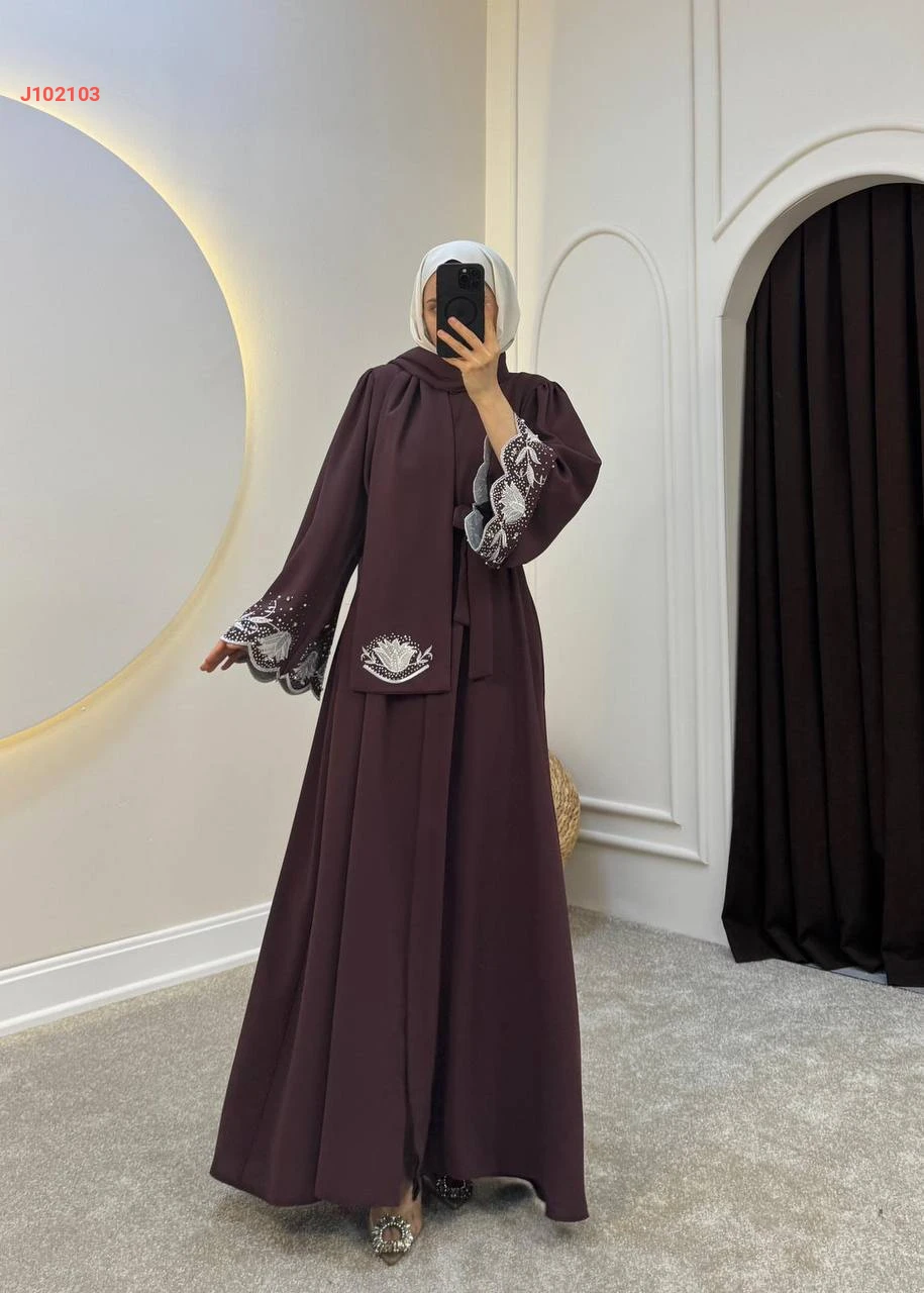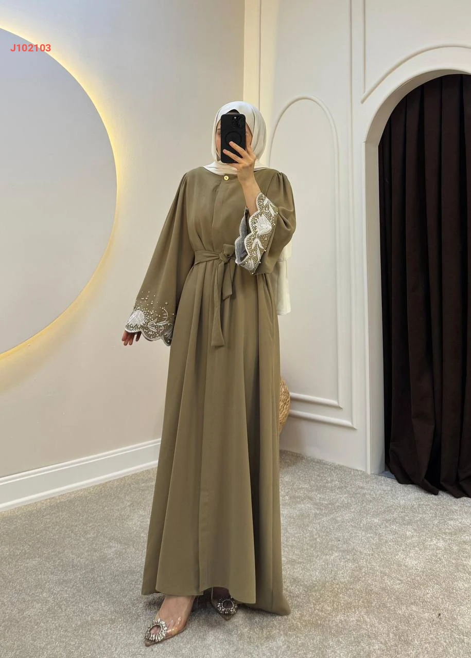 عباية بأزرار مع شال وأكمام تطريز شك فضي مع حزام