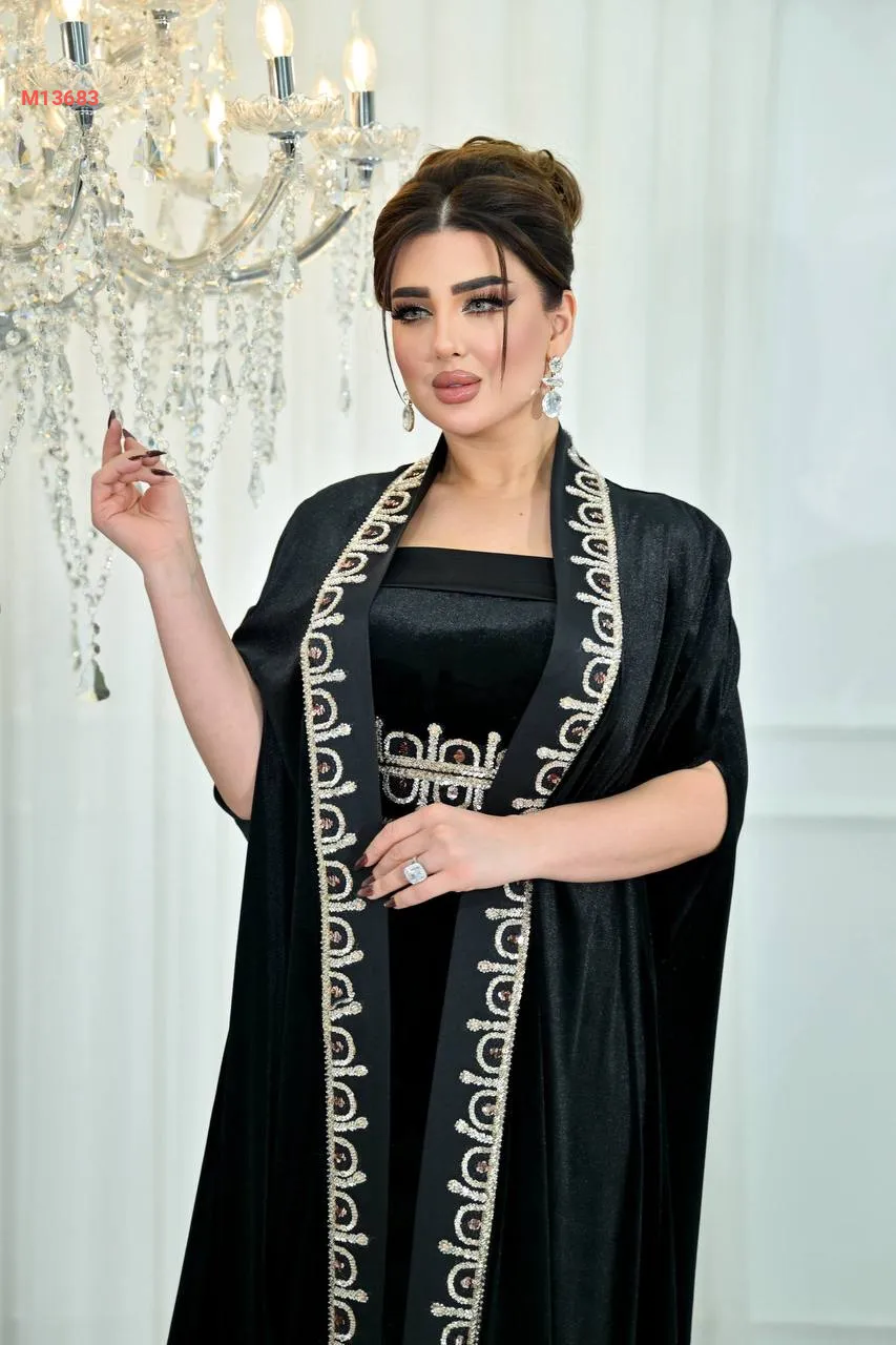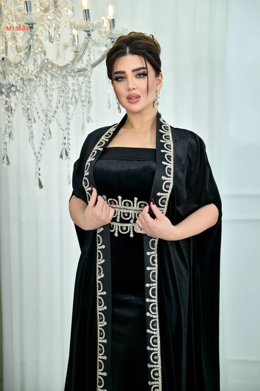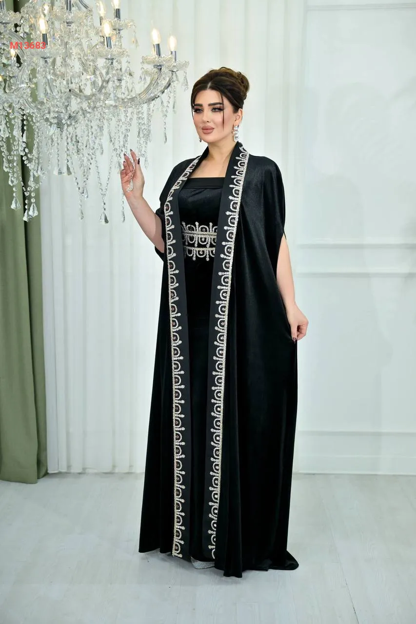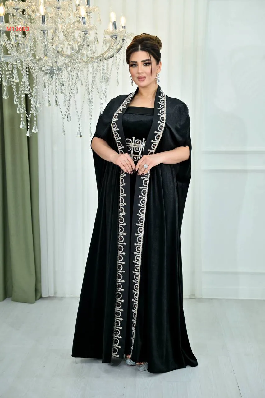 عباية مع فستان مخمل مرصعة بالكريستال من الأطراف والخصر