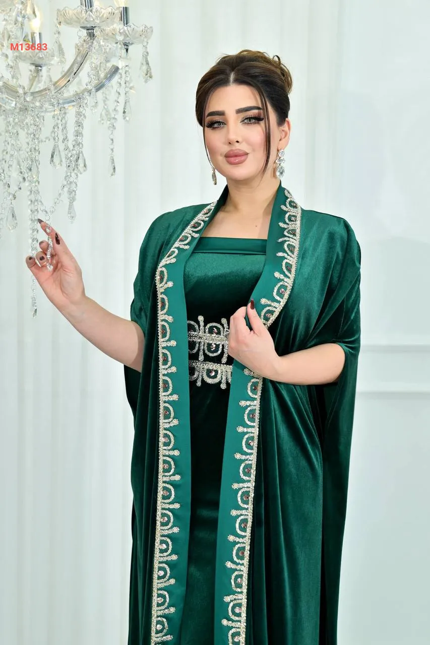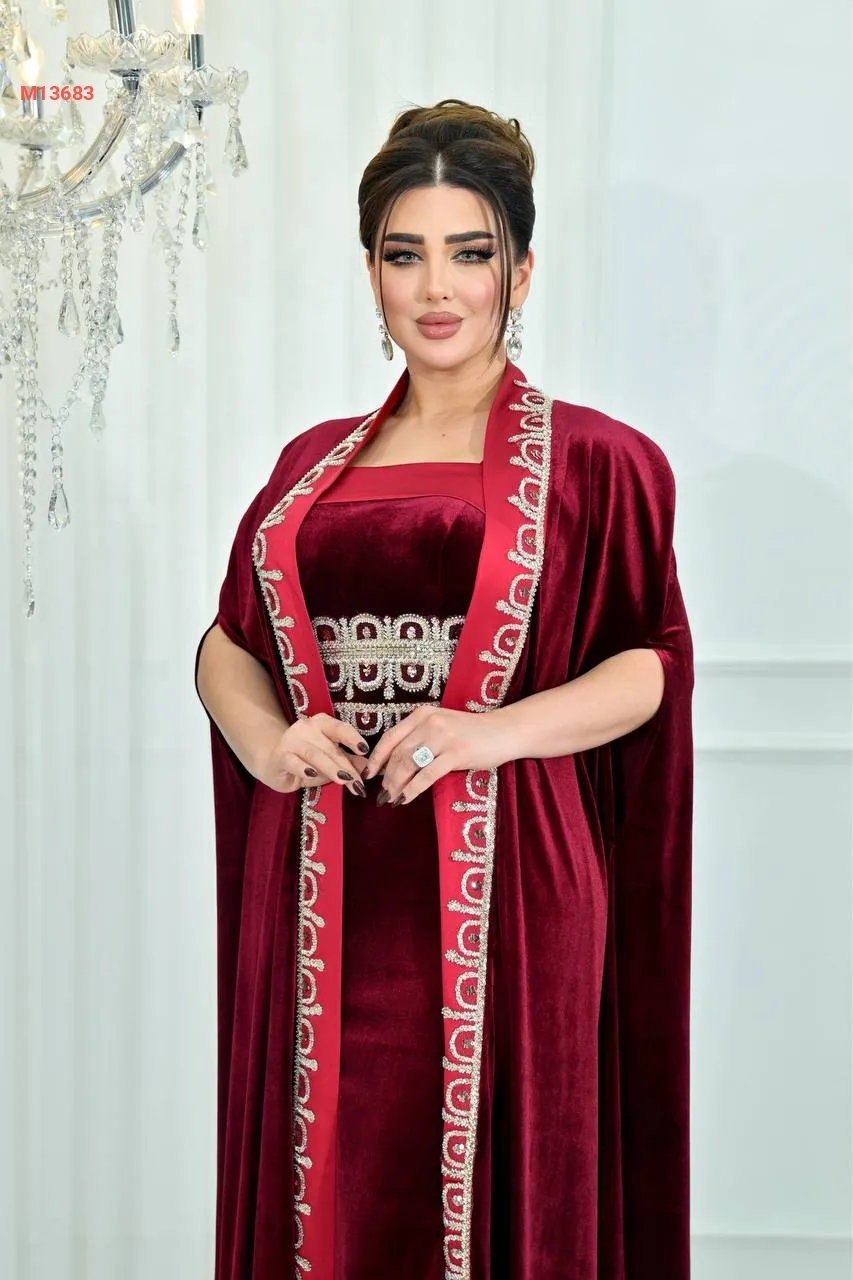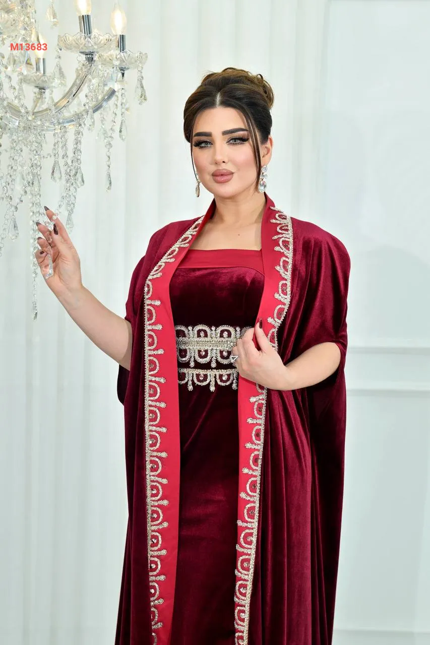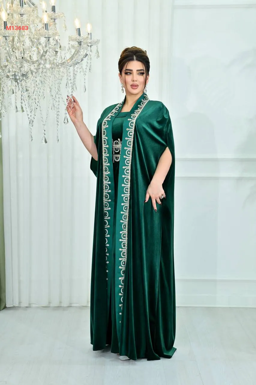 عباية مع فستان مخمل مرصعة بالكريستال من الأطراف والخصر