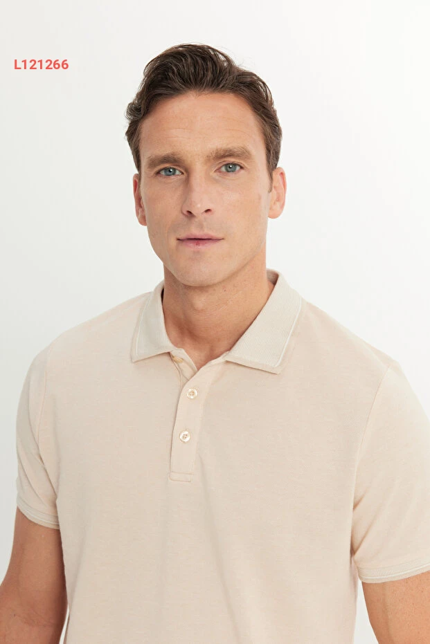 تي شيرت بولو مريح للرجال من كوتن بمقص مناسبة بلون بيج فاتح وأبيض من آلتي نيلدز كلاسيكس