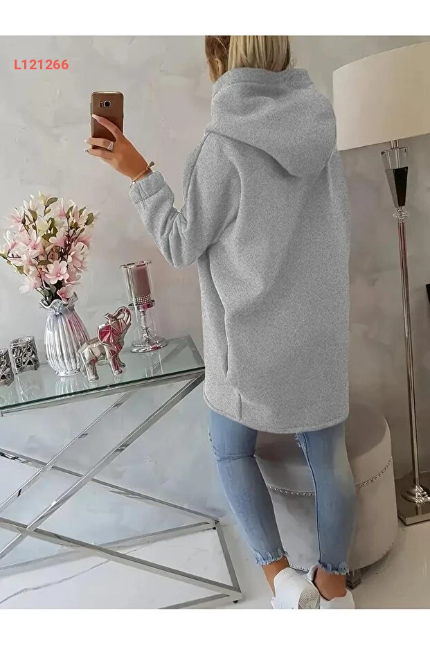 سويت شيرت نسائي غير متناظر بسحاب وغطاء رأس - قماش سميك - طراز مريح يومي