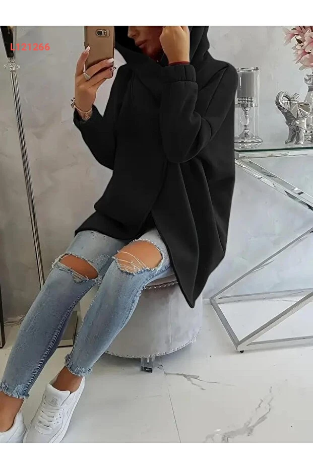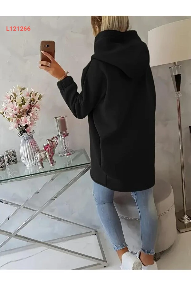 سويت شيرت أسود نسائي مزود بقبعة وسحاب غير متوازن - خامة ثقيلة - أسلوب يومي مريح