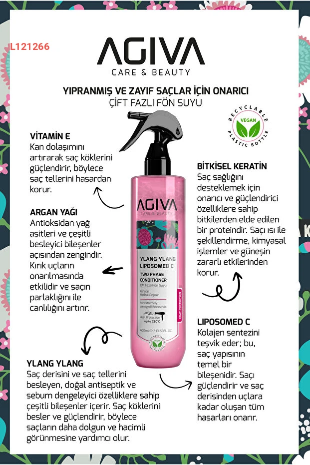 استمتع بشعر صحي ولامع مع سبراي "Agiva Ylang Ylang Liposom C" ثنائي الطور، المصمم لحماية شعرك من تأثيرات الحرارة. بفضل مكوناته الطبيعية ونظامه الفعال، يوفر هذا المنتج تغذية عميقة وترطيبًا مكثفًا، مما يجعل شعرك أكثر مرونة وسهولة في التصفيف. مثالي للباحثين عن العناية بالشعر بطريقة نباتية وصديقة للبيئة.