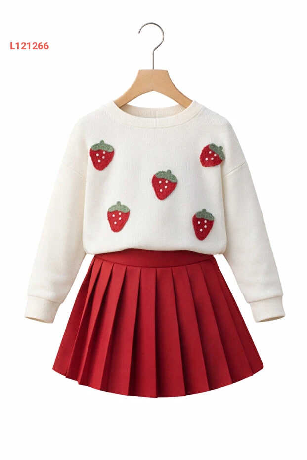 طقم فستان لطيف بنقشة الفراولة للبنات مع تنورة مكسّرة