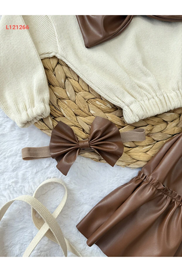 اجعل صغيرتك تتألق بأناقة مع طقم AKİF GİYİM المصنوع خصيصًا للفتيات والرضع. يتضمن طقمًا ساحرًا يتألف من تنورة جلدية رائعة وقميص مزين بالفيونكة، بالإضافة إلى بندانا أنيقة ترسم الابتسامة على وجهها. هذا الطقم يجمع بين الراحة والتميز، مما يجعله الخيار المثالي لمناسباتكم الخاصة.