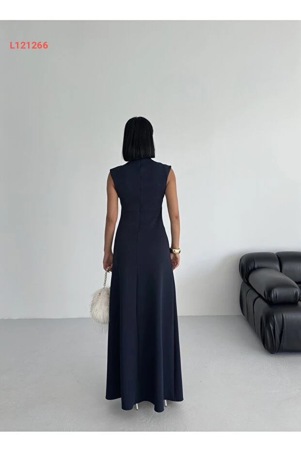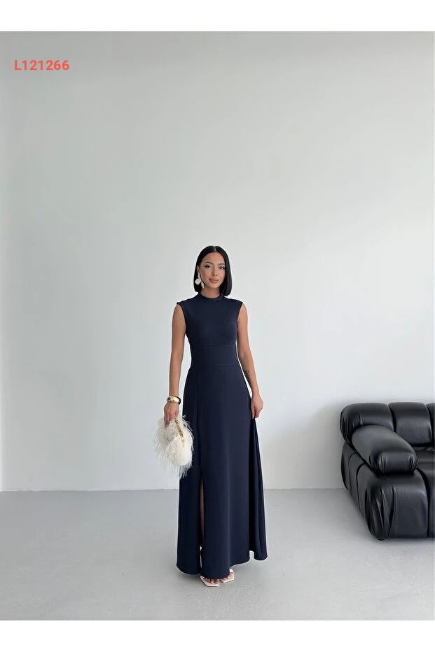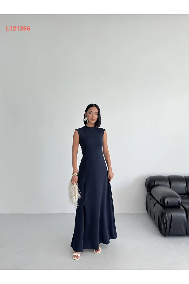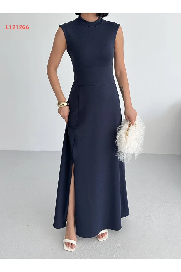 فستان ماكسي أزرق بياقة دائرية وشقوق من مجموعة ألفودو موضة