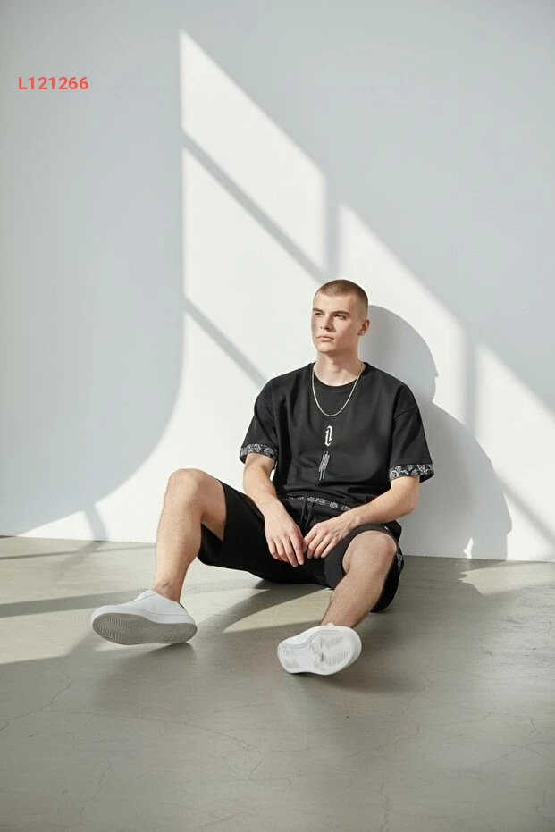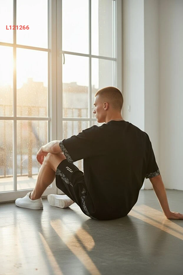 تي شيرت شورت ألتاميرا الرجالي الأسود مع طباعة عمودية بتصميم واسع