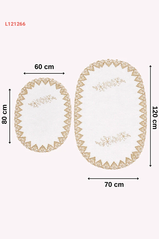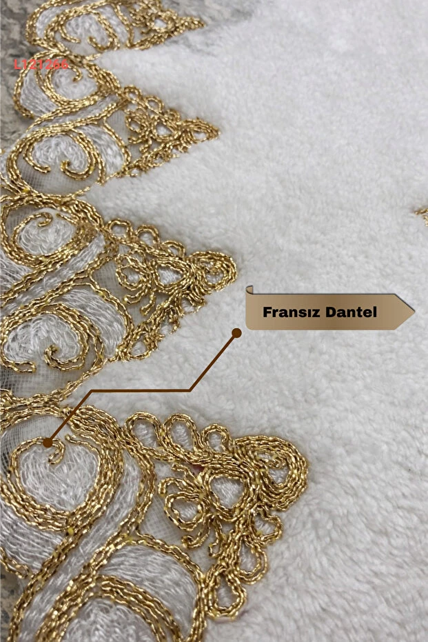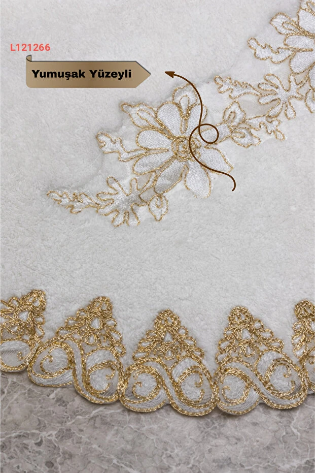 بساطا الحمام الفاخر ذات التصميم الفرنسي والدانتيل باللون الأبيض والذهبي، مع سطح ناعم وقاعدة مضادة للانزلاق - مجموعة من قطعتين