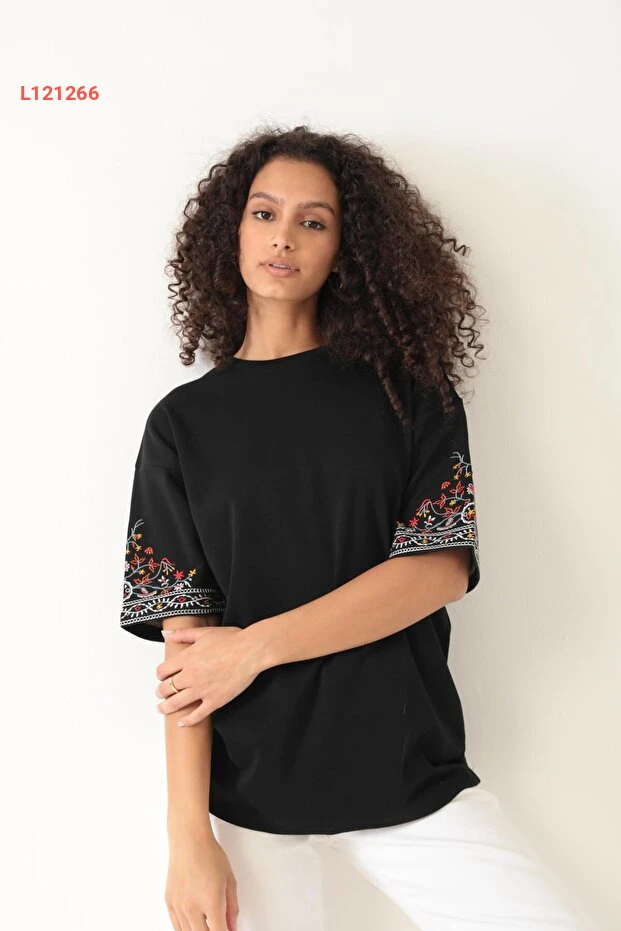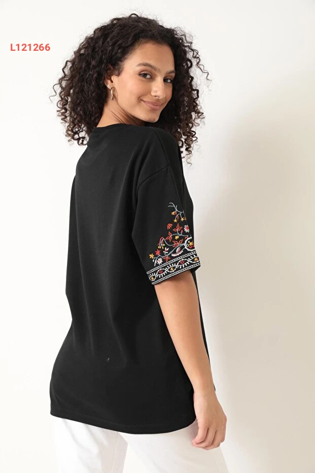 تي شيرت نسائي واسع بأكمام قصيرة مزين بالتطريز الإتفنيك - أسود