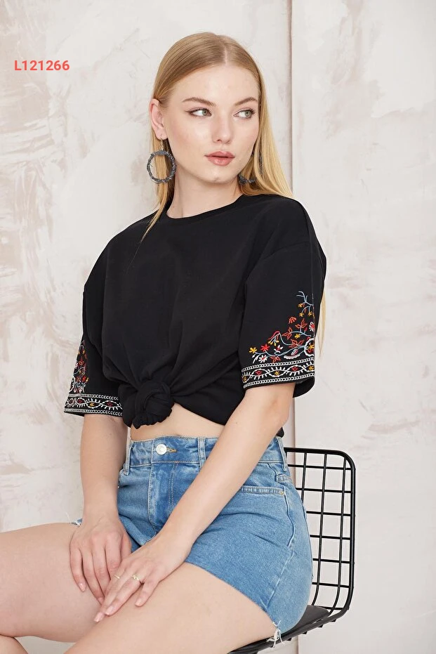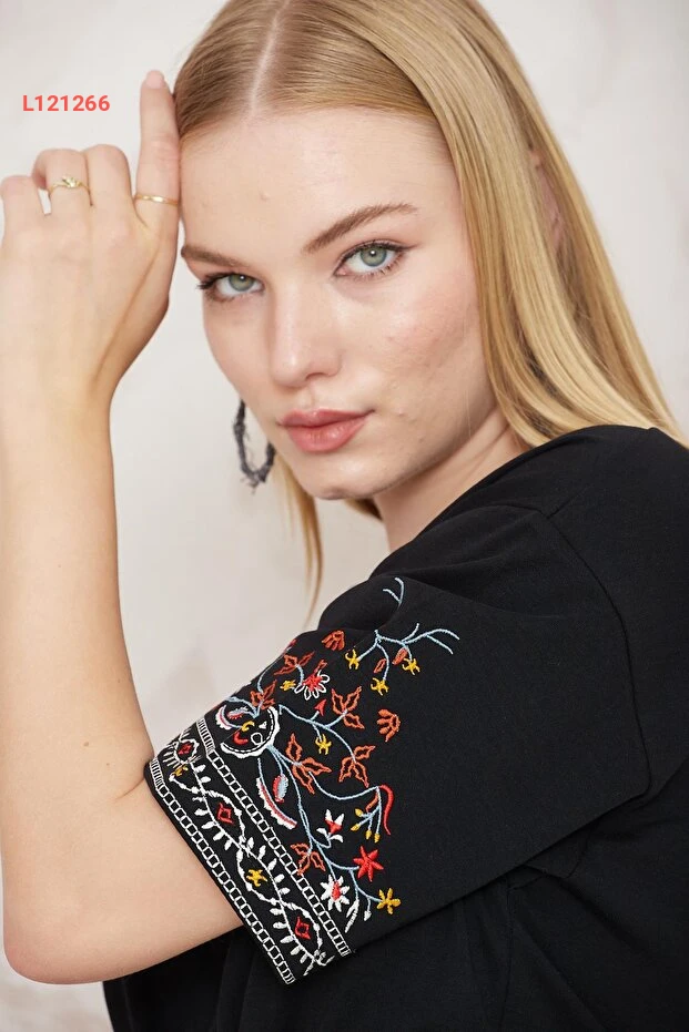 استمتعي بأناقة غير تقليدية مع تيشيرت AMİDA ذو الأكمام القصيرة المصنوع من القماش الناعم والمريح. يتميز بتصميمه الأنيق في الأسود مع تطريزات عرقية تضفي لمسة من التفرد، مما يجعله خياراً مثالياً لإطلالة عصرية ومريحة في جميع المناسبات. ارتدي هذا الـ T-shirt مع بنطلون جينز أو تنورة لإطلالة رائعة وجذابة!