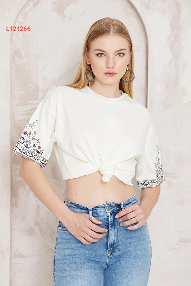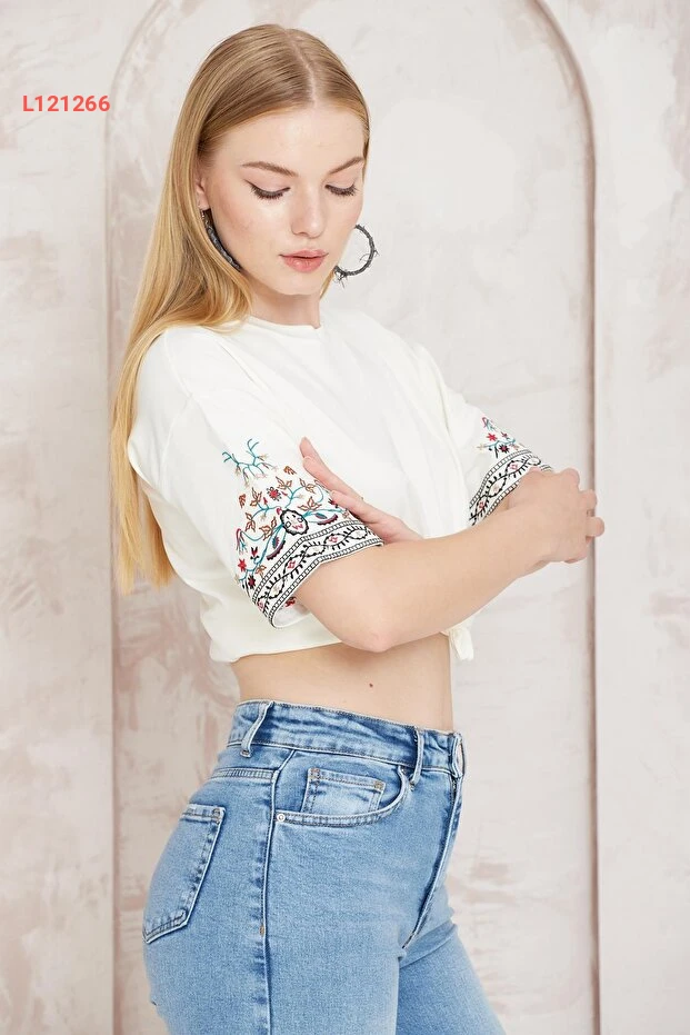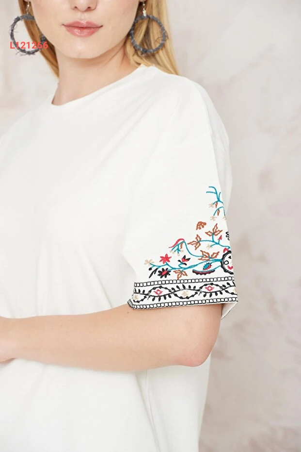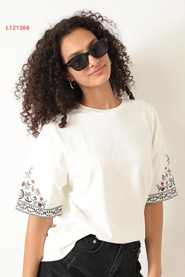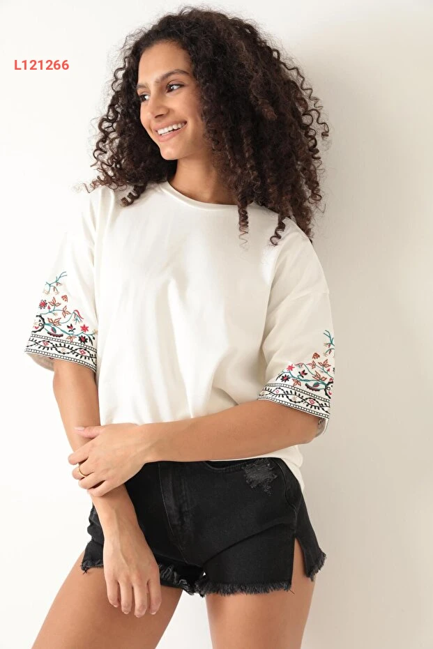 تي شيرت نسائي بأكمام قصيرة بتصميم إيثني مطرز - أميدّا