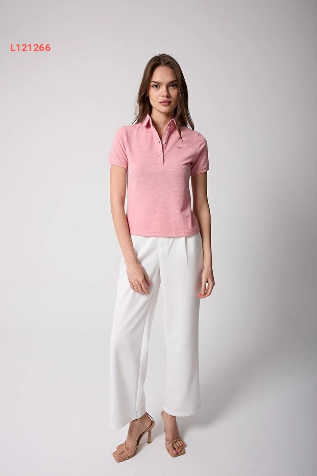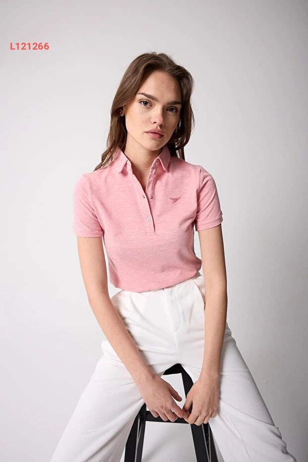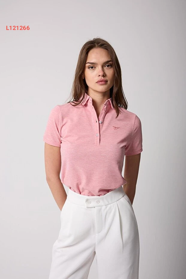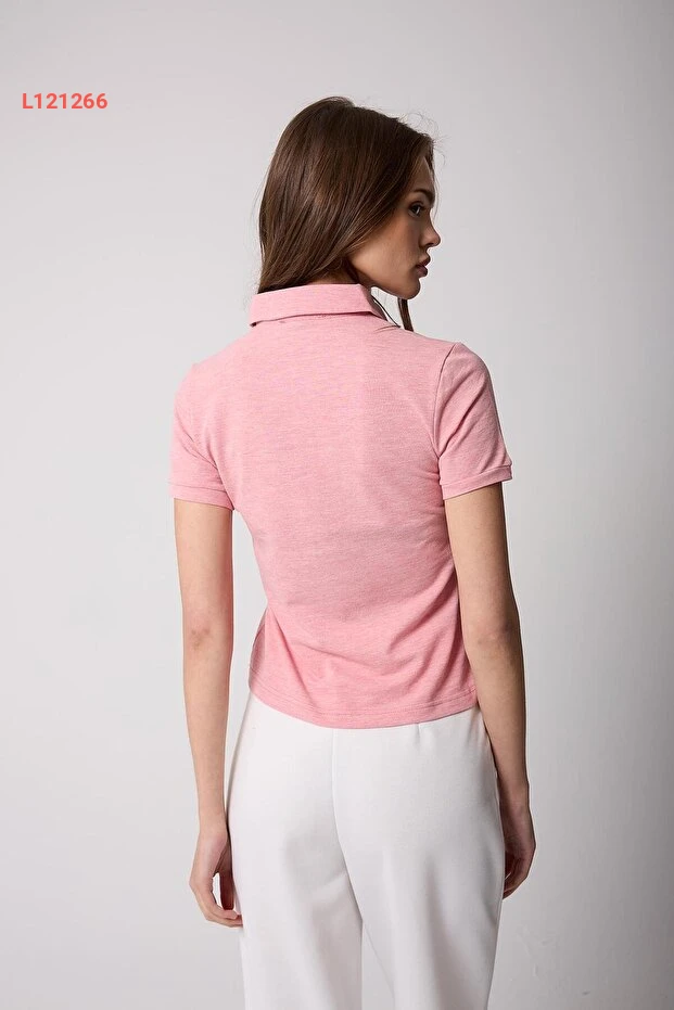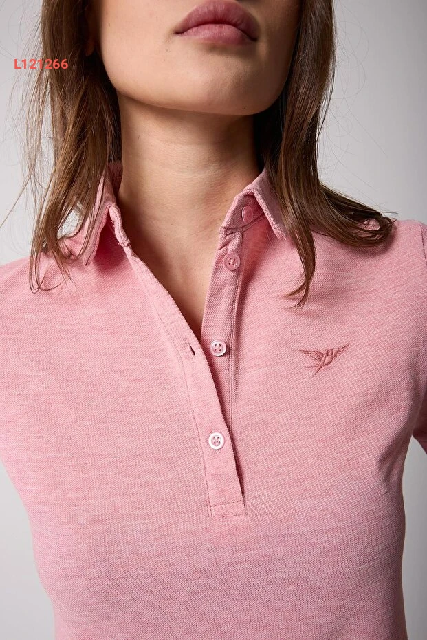 تي شيرت نسائي بياقة بولو وردية مزودة بأزرار - AMİDA