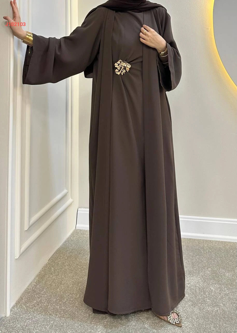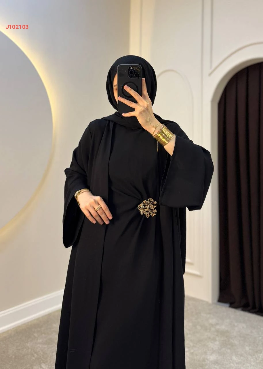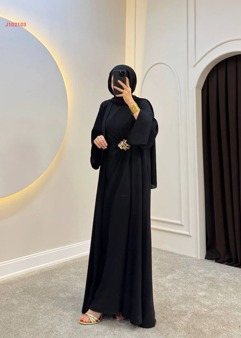 عباية مع فستان سادة مزين بدبوس ذهبي عند الخصر