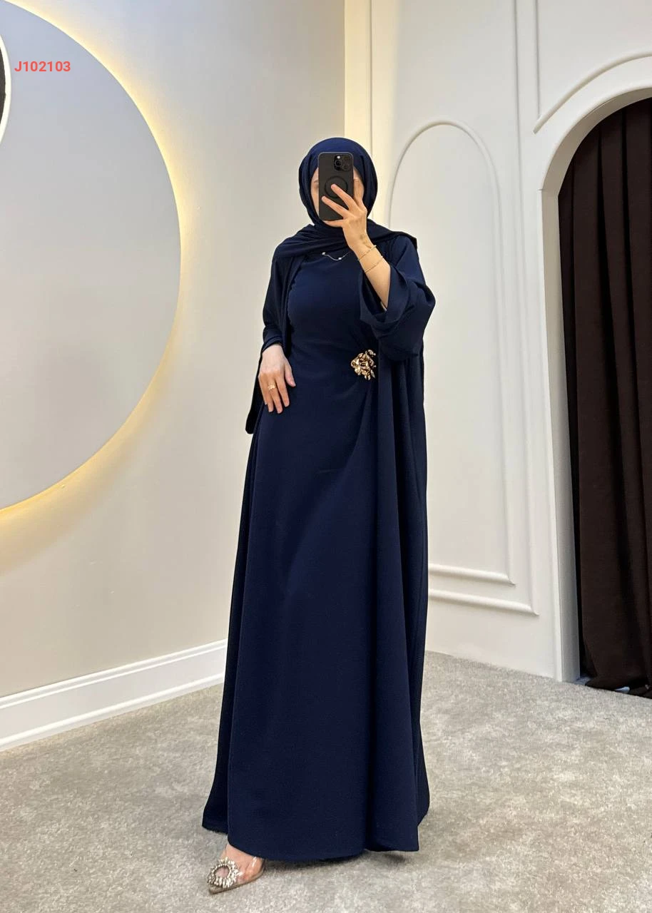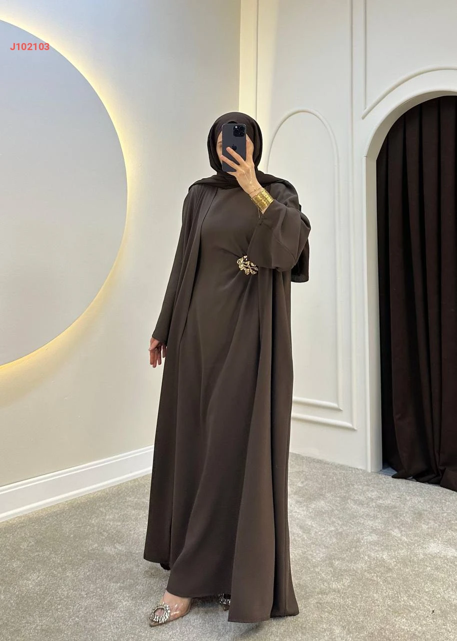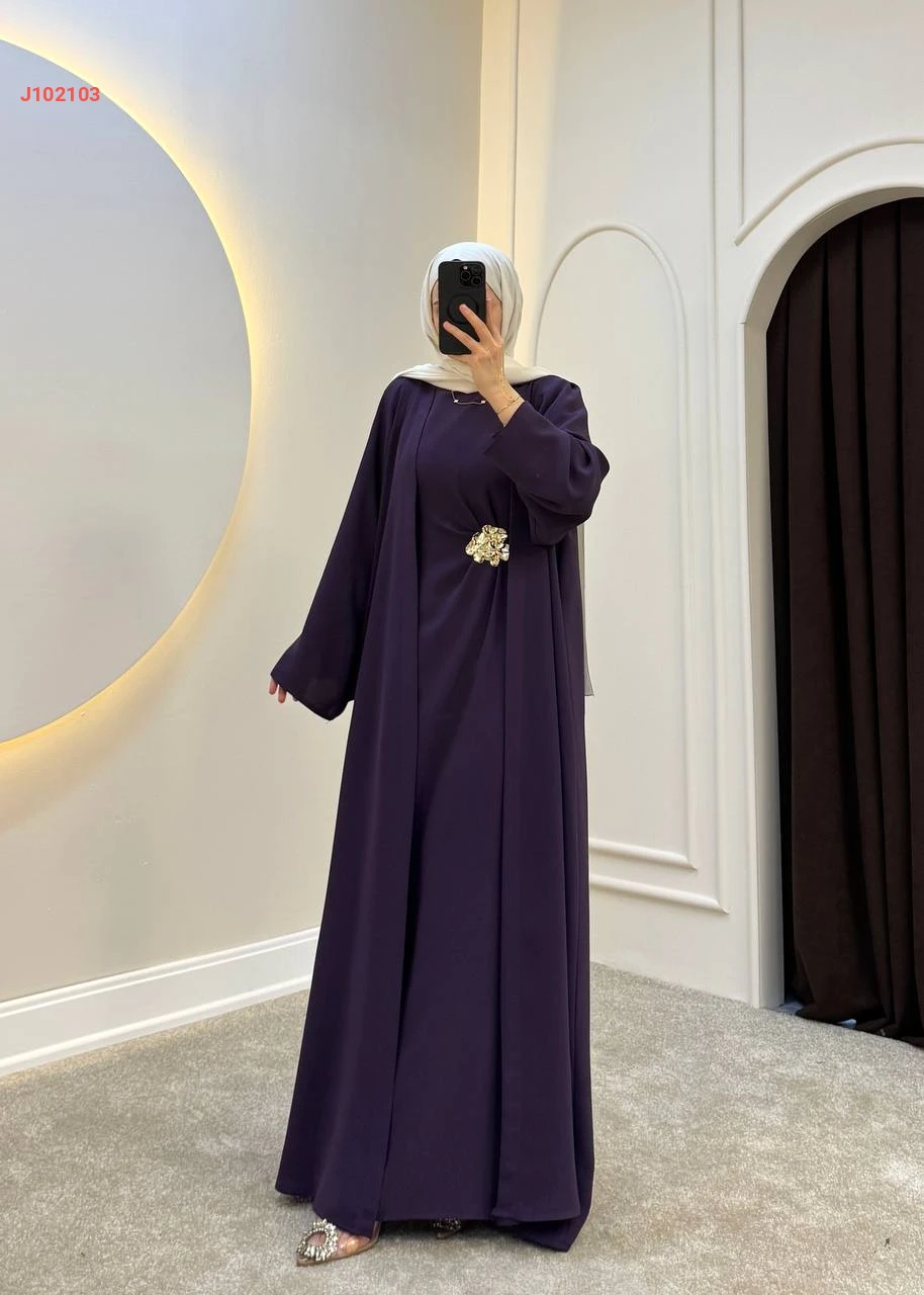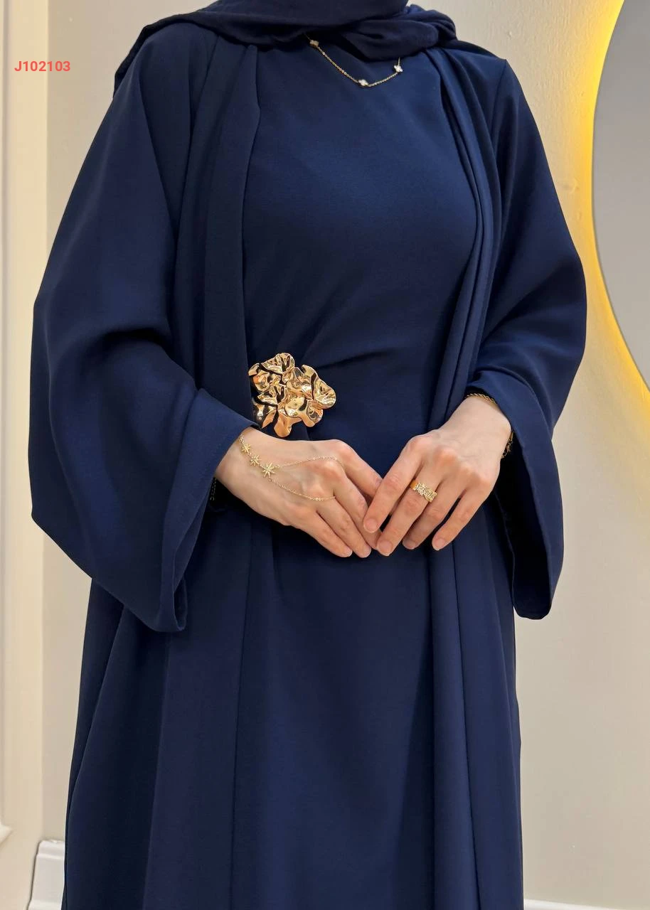 عباية مع فستان سادة مزين بدبوس ذهبي عند الخصر