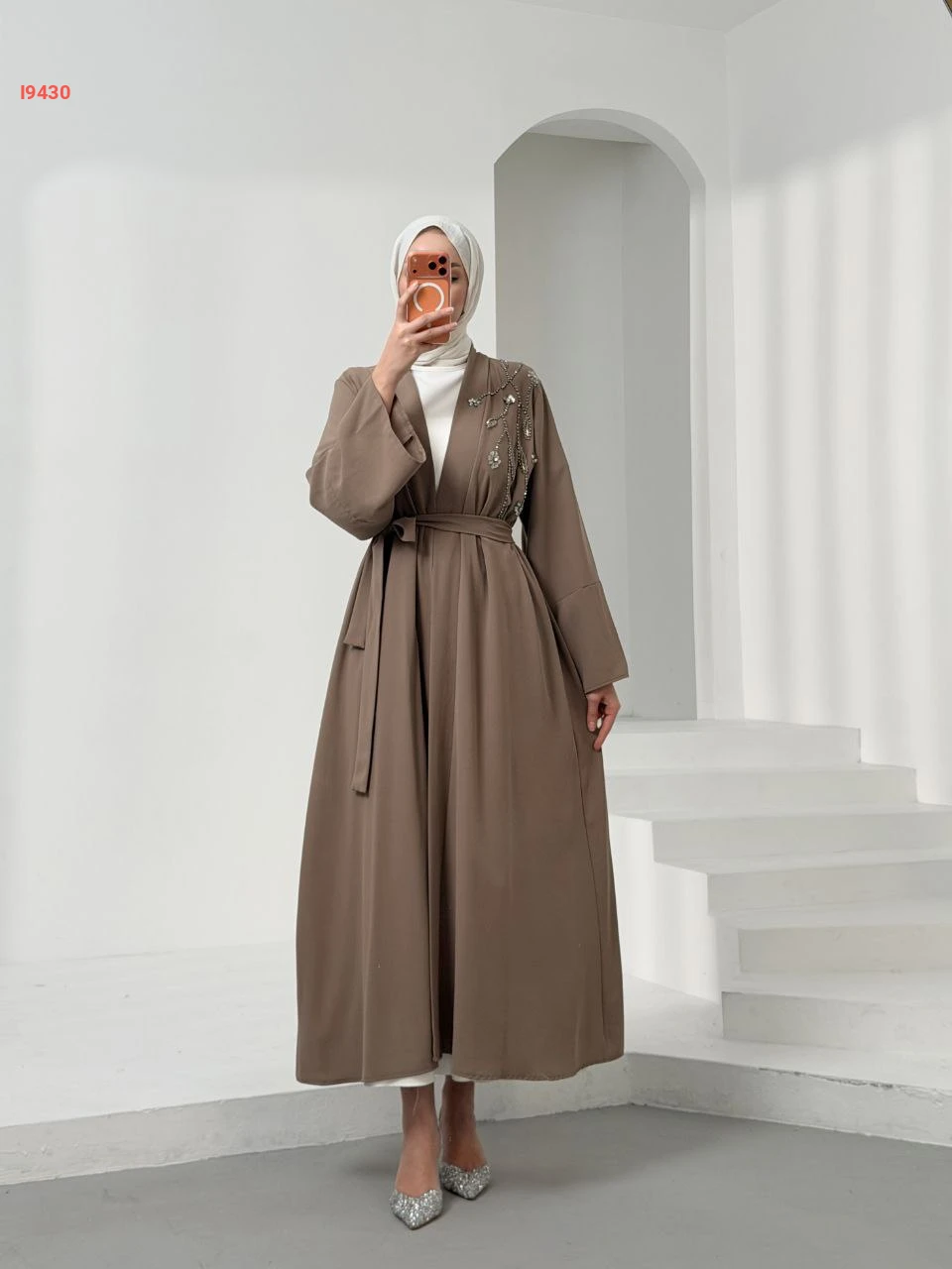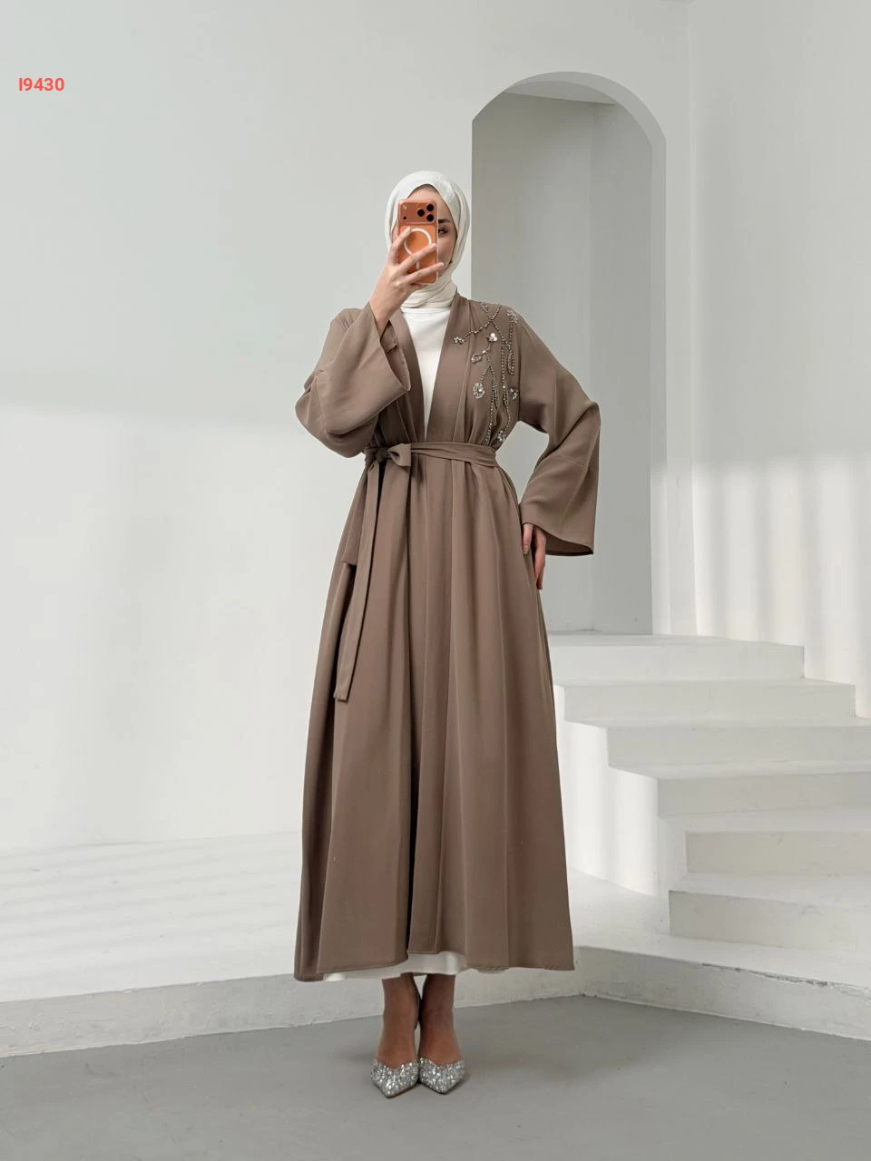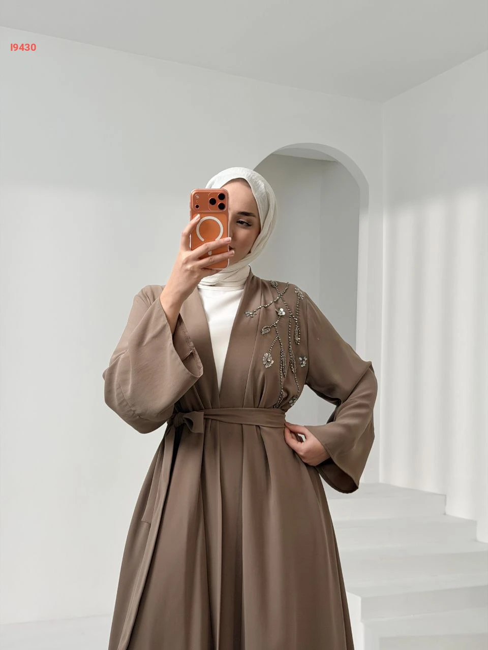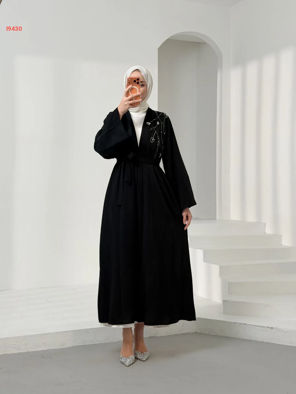 عباية بكسرات مع حزام بتطرز عرق شك بالخرز والألماس