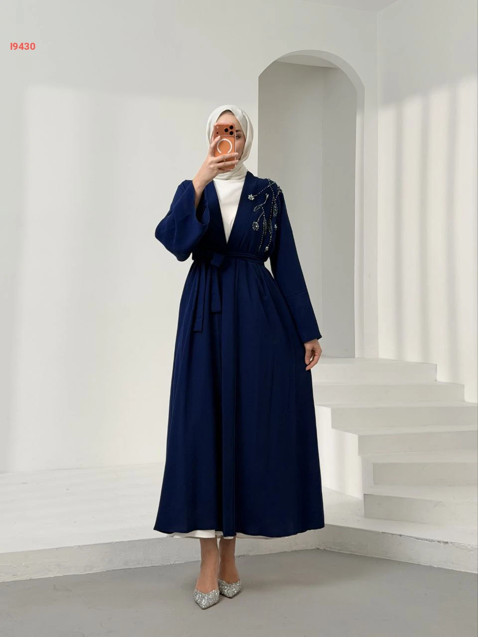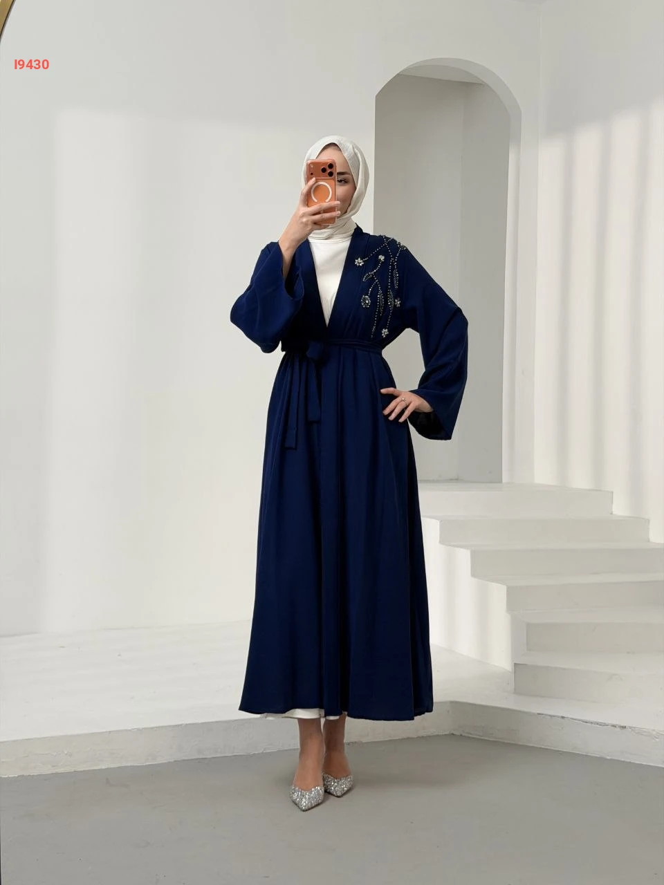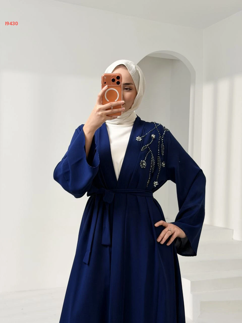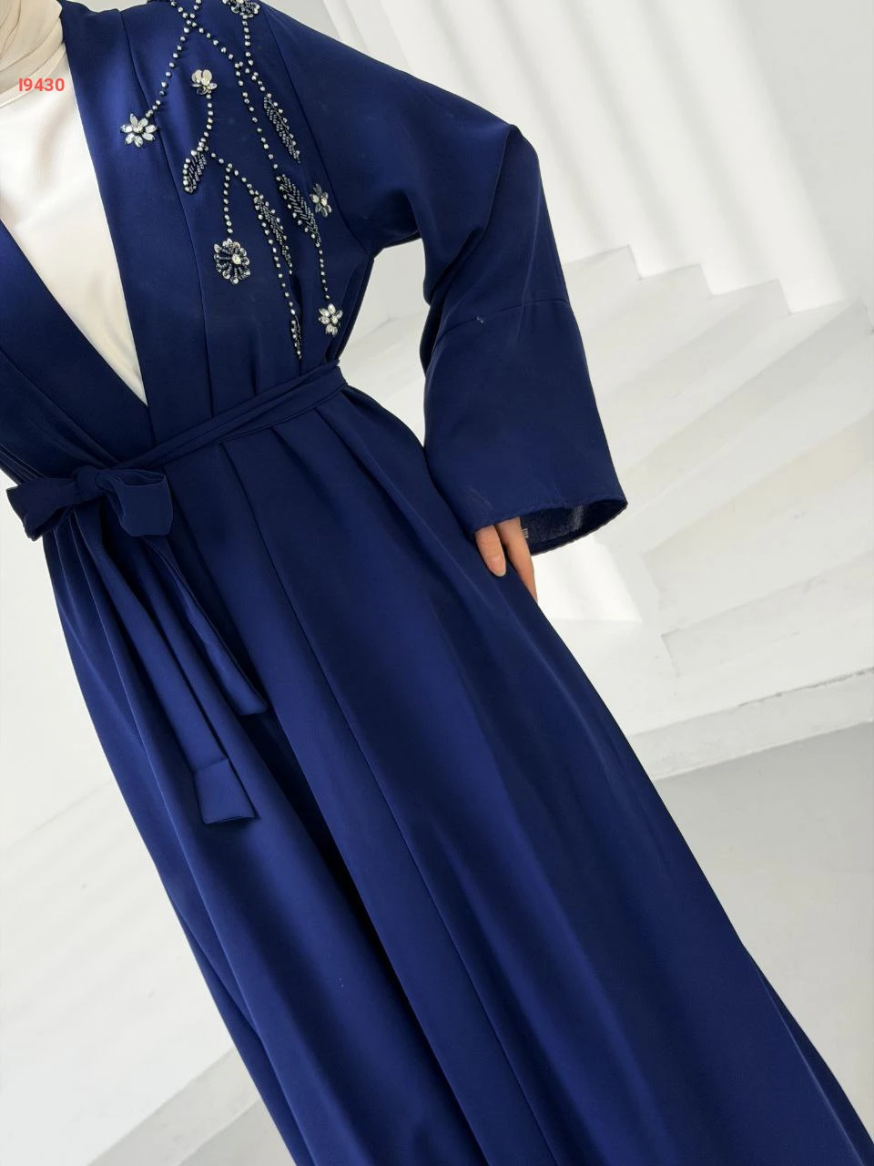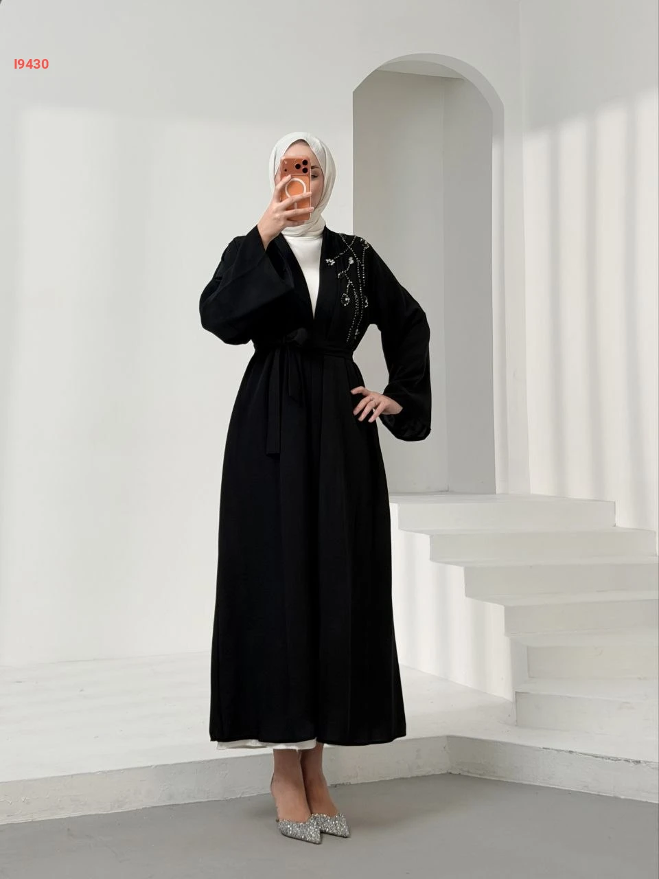 عباية بكسرات مع حزام بتطرز عرق شك بالخرز والألماس
