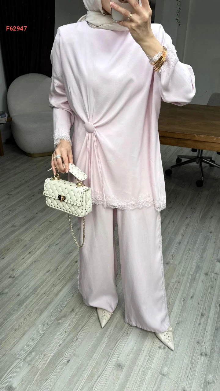 طقم أنيق ومحتشم من قماش حريري، يتميز ببلوزة طويلة بتفاصيل عقدة جانبية ودانتيل رقيق، وبنطال واسع مريح،