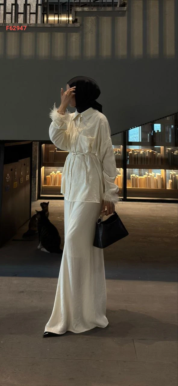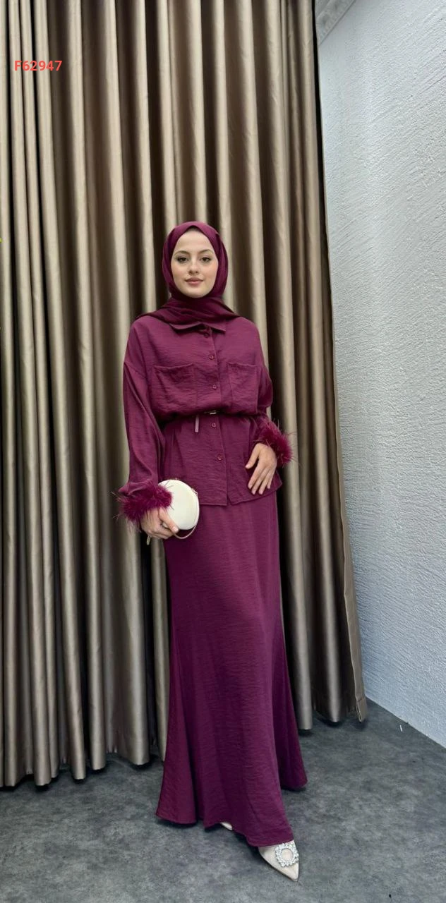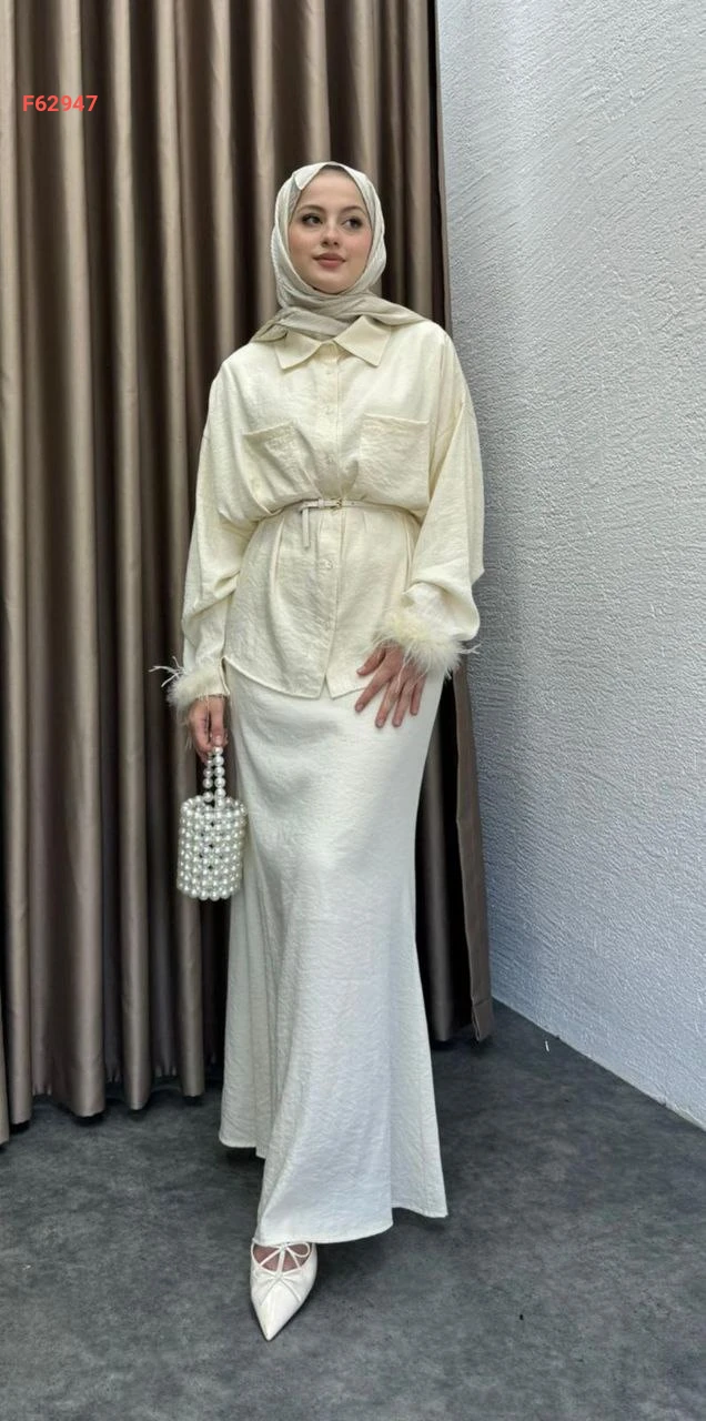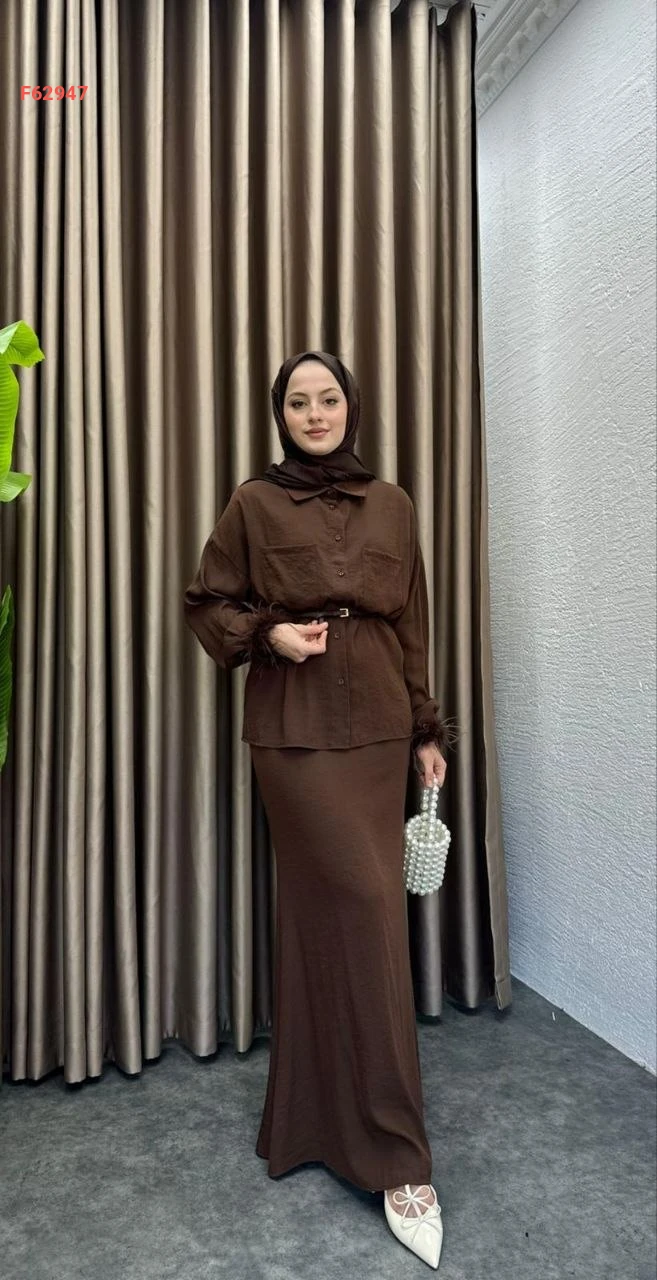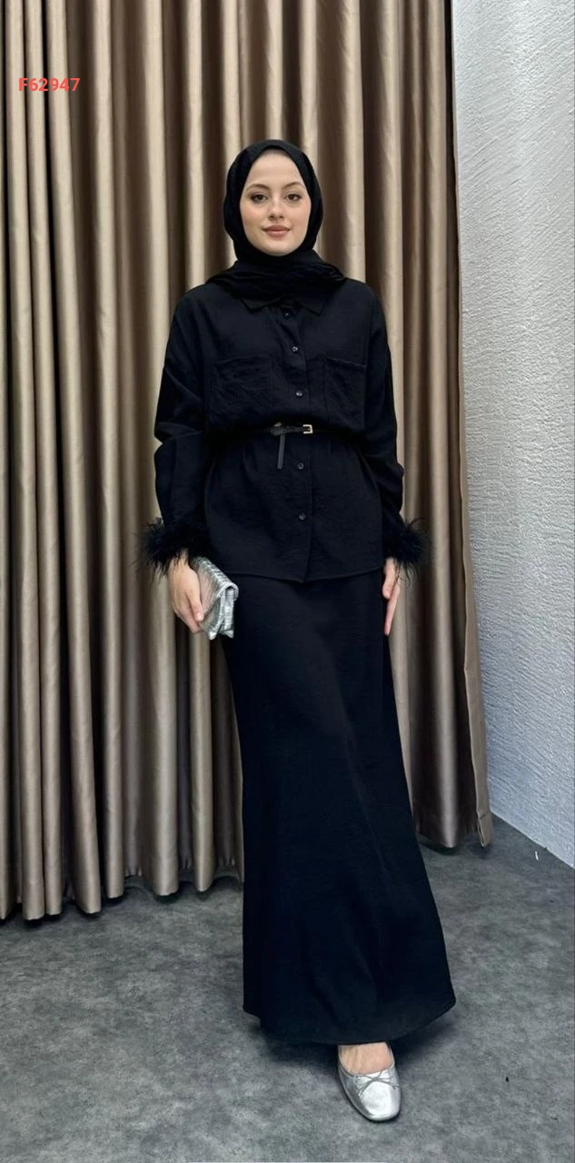 طقم نسائي أنيق ومحتشم يتكون من قطعتين، بلوزة منقوشة بأكمام ريش وتنورة طويلة سادة