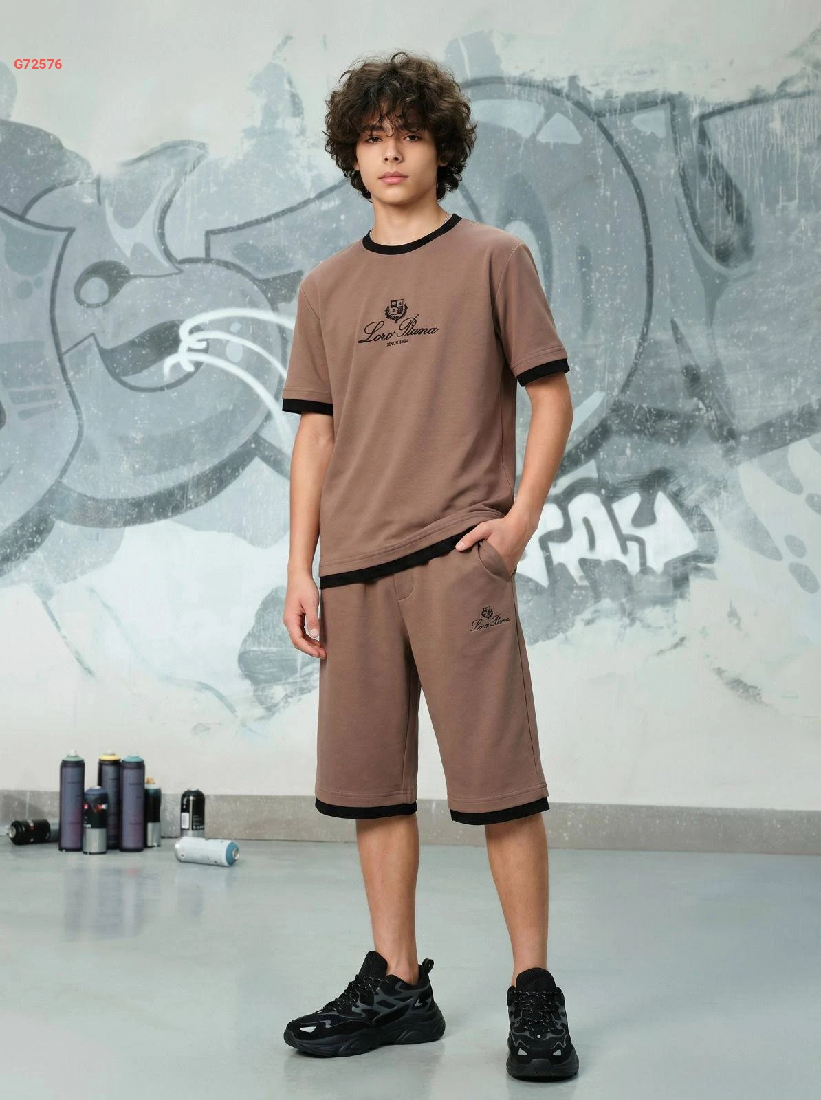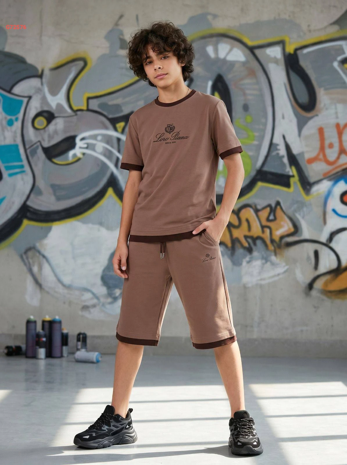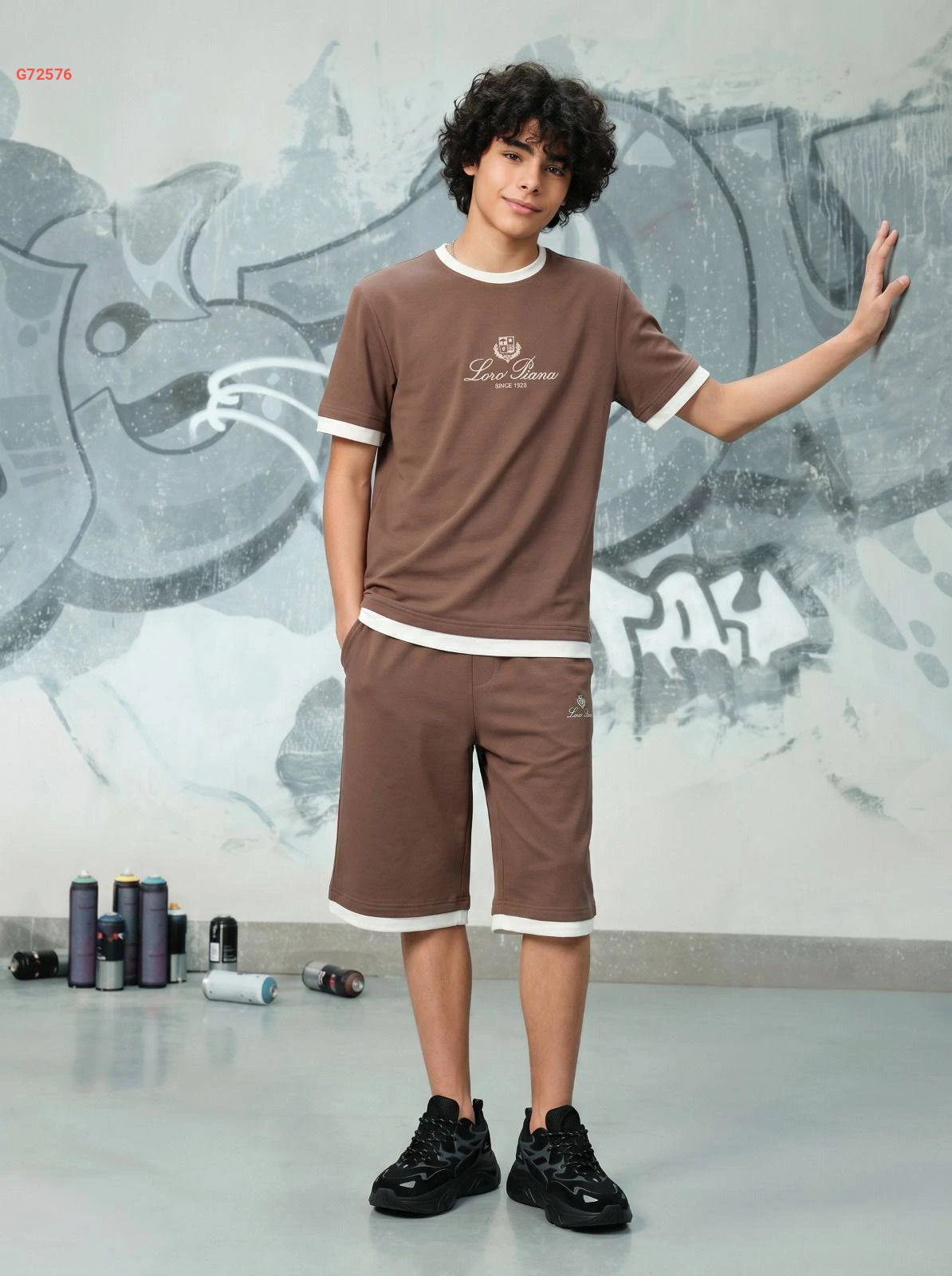 طقم ولادي أنيق من "Loro Piana" يتكون من تيشرت وشورت مع حواف متباينة