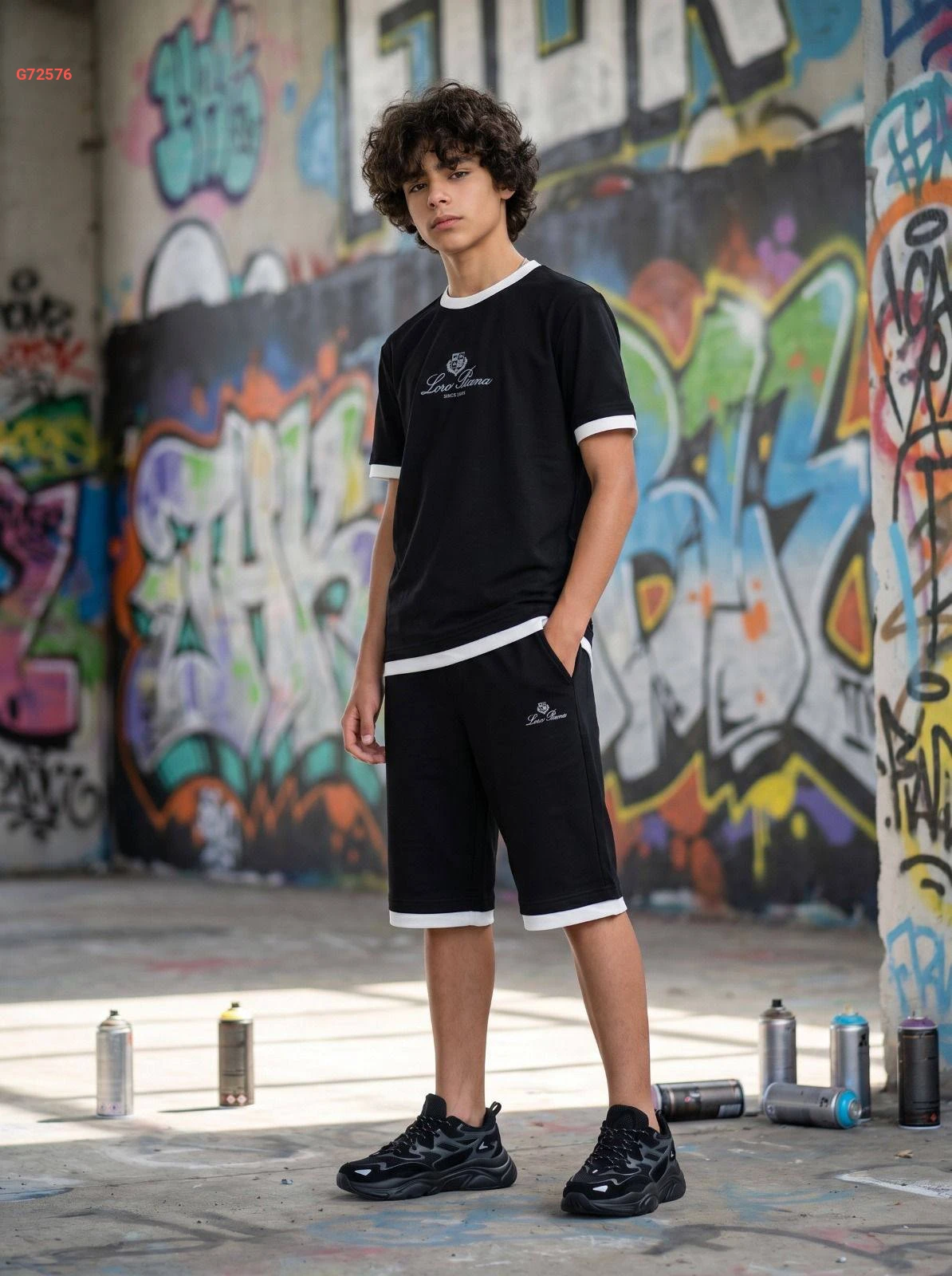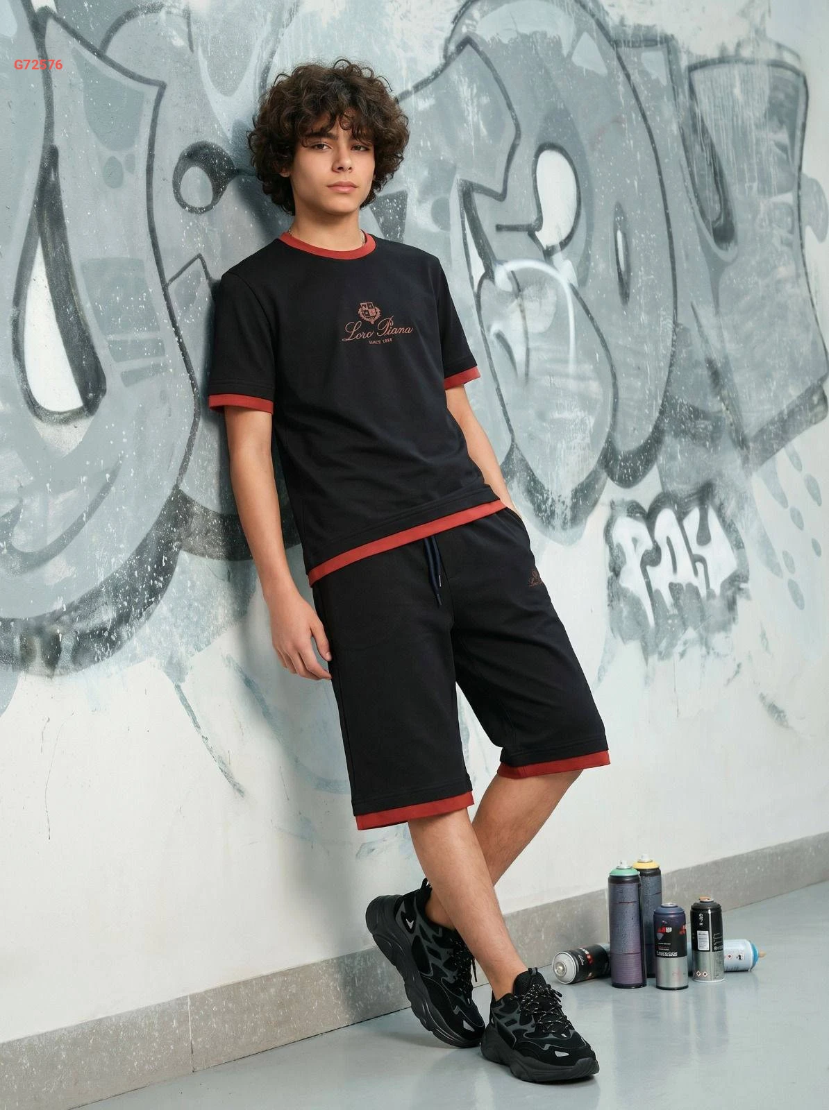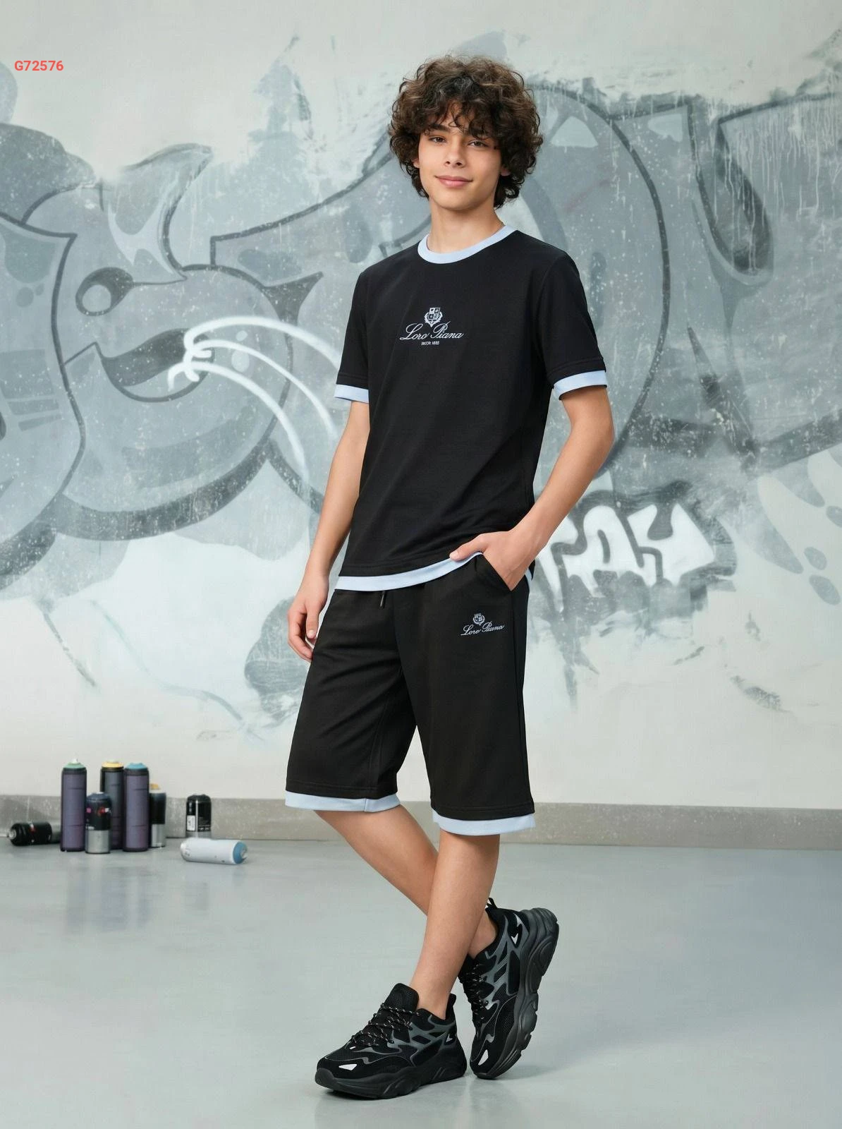 طقم ولادي أنيق من "Loro Piana" يتكون من تيشرت وشورت مع حواف متباينة