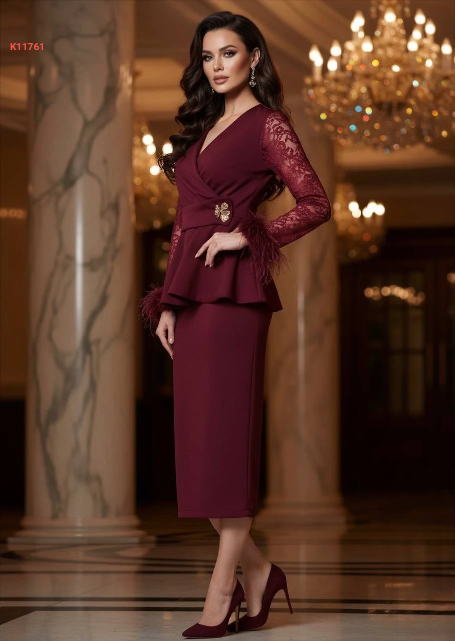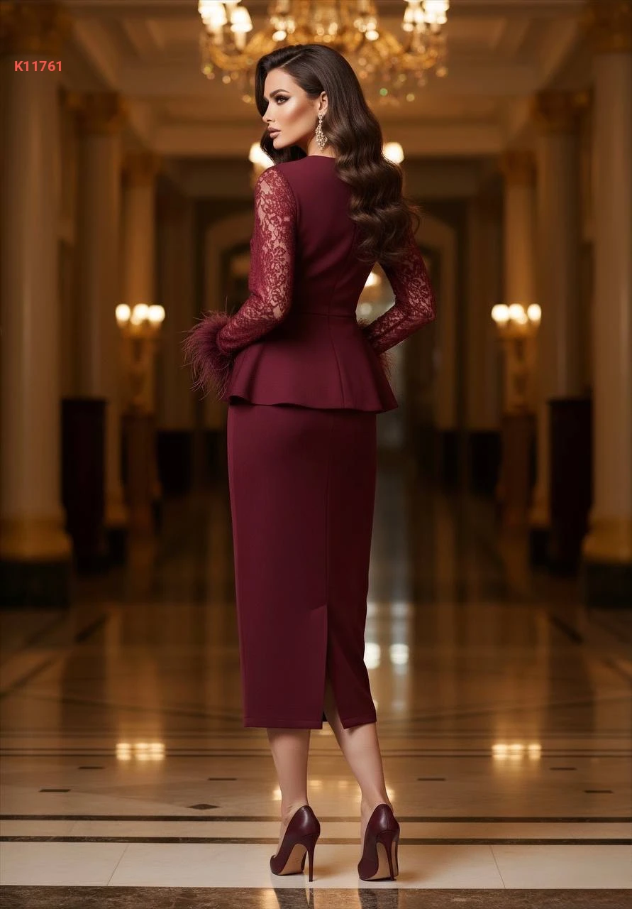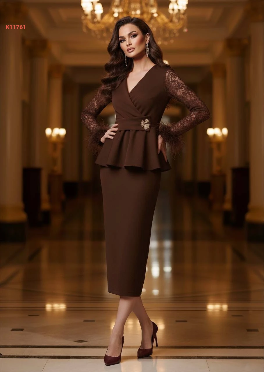 فستان أنيق بأكمام دانتيل وريش