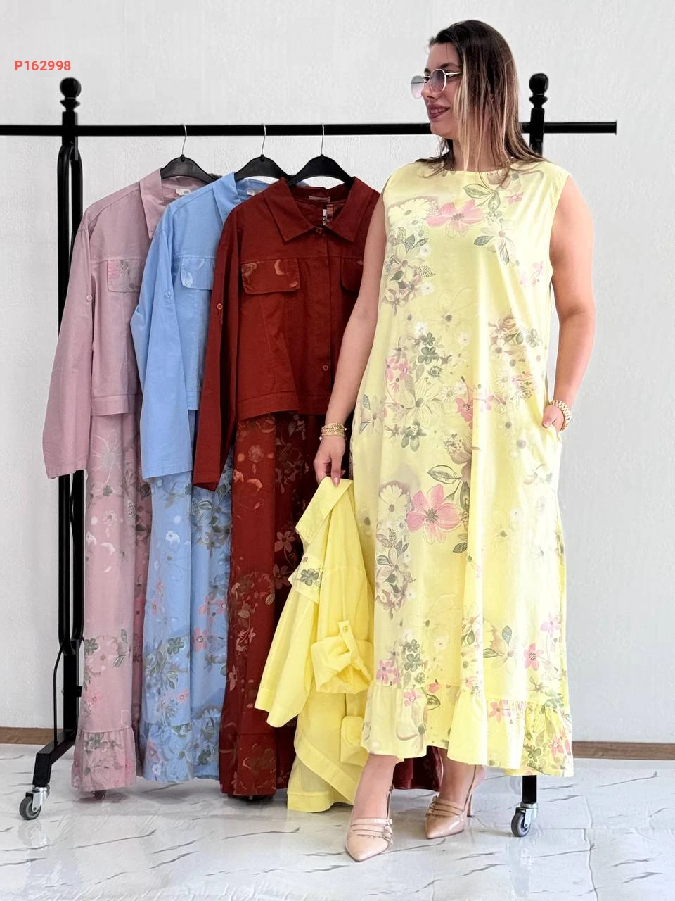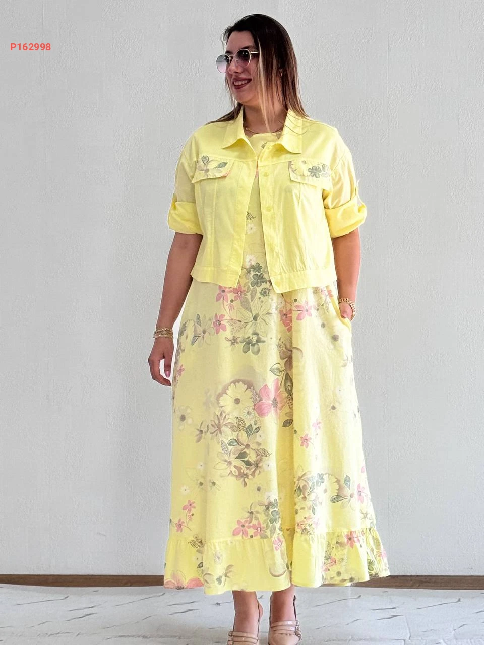 طقم نسائي صيفي أنيق يتكون من فستان "ماكسي" مشجر بنقوش الورد مع جاكيت قصير متناسق لإطلالة عصرية ومريحة.