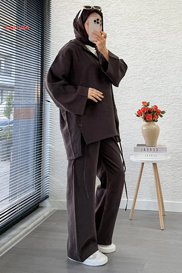 استمتعي بالأناقة والراحة مع طقم MELEK ARAZ ذو الكُبول والمصنوع من أجود الأقمشة. تصميمه الفريد مع تفاصيل الأزرار يضفي لمسة عصرية، بينما يضمن اللون البني الدافئ تنسيقًا سهلاً مع مختلف الإطلالات. ارتدي هذا الطقم المثالي لأي مناسبة لتشعري بالثقة والتميز!