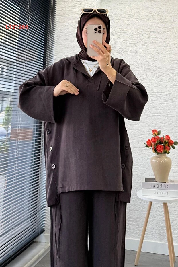 طقم مزدوج نسائي بقلنسوة وأزرار - بني من ميليك أراز