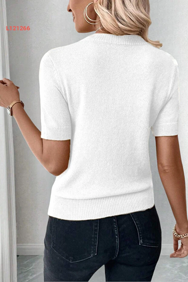 بلوزة بيضاء ذات ياقة دائرية وكُمَين قصيرين من AQE فاشن
