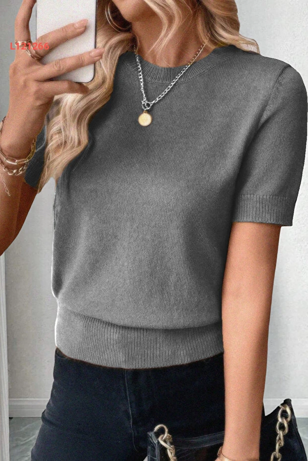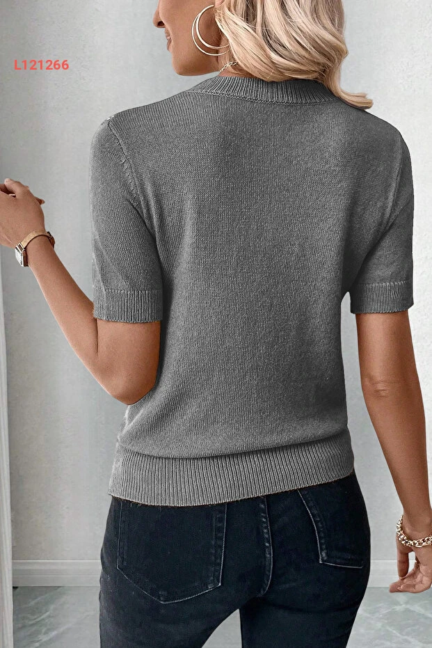 بلوزة رمادية قصيرة الأكمام بتصميم ياقَة دائرية من AQE FASHION
