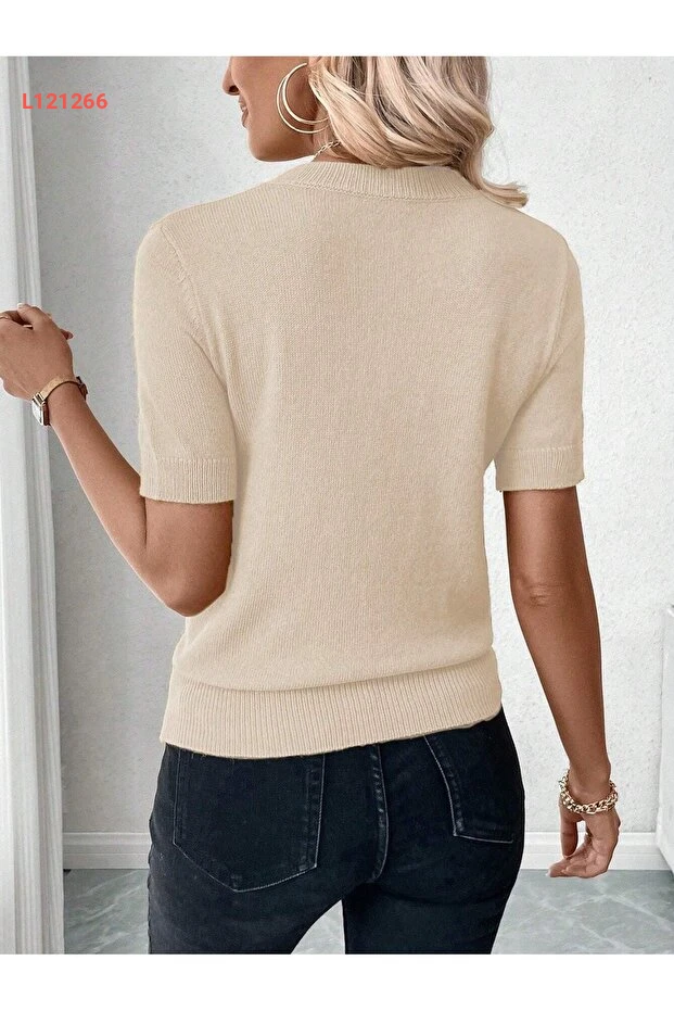 بلوزة قصيرة الأكمام من AQE FASHION بياقة دائرية قماش ليكرا بلون البيج