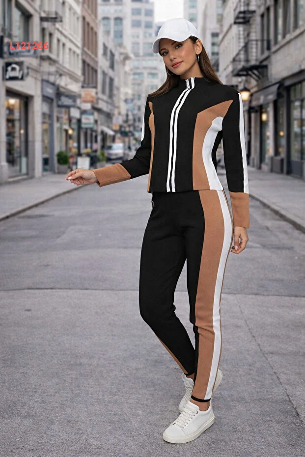 طقم ملابس رياضية نسائي من AQE FASHION بلون كاميل بأزرار طويلة وصدرية بولو مع ليغينغ ملون