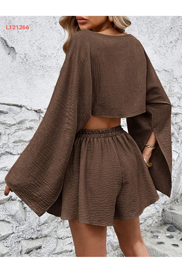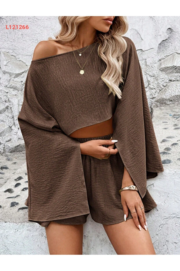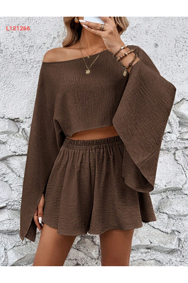 استمتع بأناقة مريحة مع طقم Arfami المكون من بلوزة وشورت، الذي يتميز بتفاصيل الكتف المنخفضة والشقوق العصرية. مصمم من خامة ناعمة تمنحك الرحة طوال اليوم، يجمع هذا الطقم بين البساطة والأناقة ليكون الخيار المثالي لمظهر غير رسمي وعصري. elevarte!