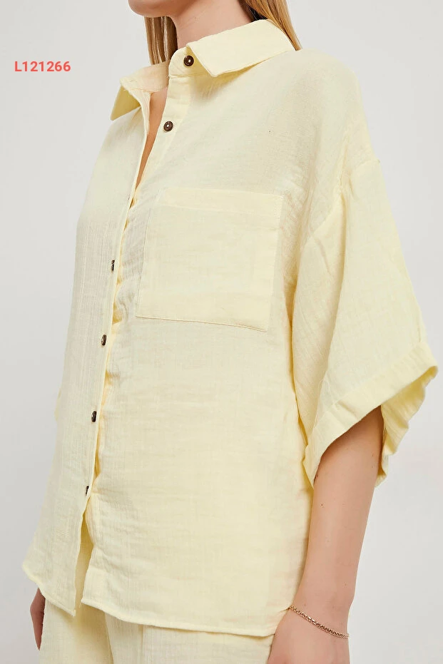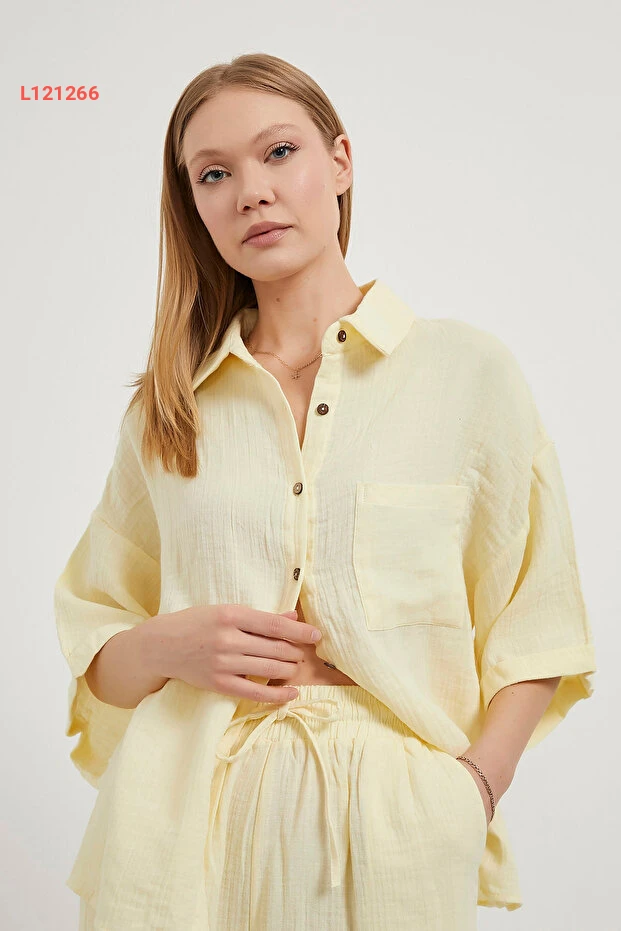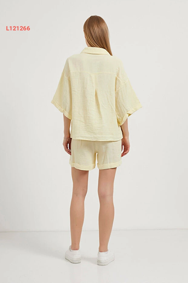 طقم صيفي نسائي قميص واسع + شورت قصير مطاطي أصفري مُصنّع من موسلين